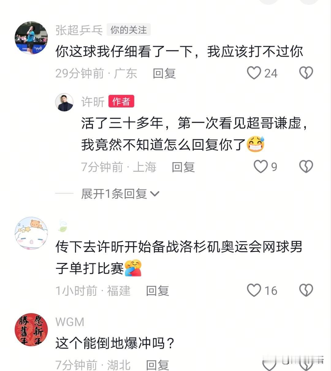 许昕:乒乓球转网球的一天。 刚刚看到许昕更新了动态,他说每周最累的体能课竟然是网球,看来还是要多打打。打了网球后,许昕说是时候找个教练了,动作跟乒乓球一样,看到有网友说:“让卡宝教你,乱花什么钱请教练”。许昕确实很全面,能打乒乓球,还能打网球,而且把网球打的跟乒乓球一样,乒乓球场对许昕来说太小了,这个场子刚好。 许昕发了抖音后,看到张超来留言:“你这球我仔细看了一下,我应该打不过你。”然后许昕回复张超说:“活了三十多年,第一次看见超哥谦虚,我竟然不知道怎么回复你了。”然后超哥说许昕打网球的反手和发球比他好,正手差不多都,他反手就会削。下次俩人见面了,可以切磋一下网球了。 许昕平时的生活也很充实啊,要经营自己的球馆,还要在上海队备战全运会,抽个时间再去打打网球。前几天向鹏去了上海,浙江队应该是和上海队一起练球了吧,向鹏还去了昕哥的球馆,跟着昕哥一起训练,向鹏也能学习到很多,希望这次的蒙彼利埃冠军赛,向鹏能够取得好成绩,加油!