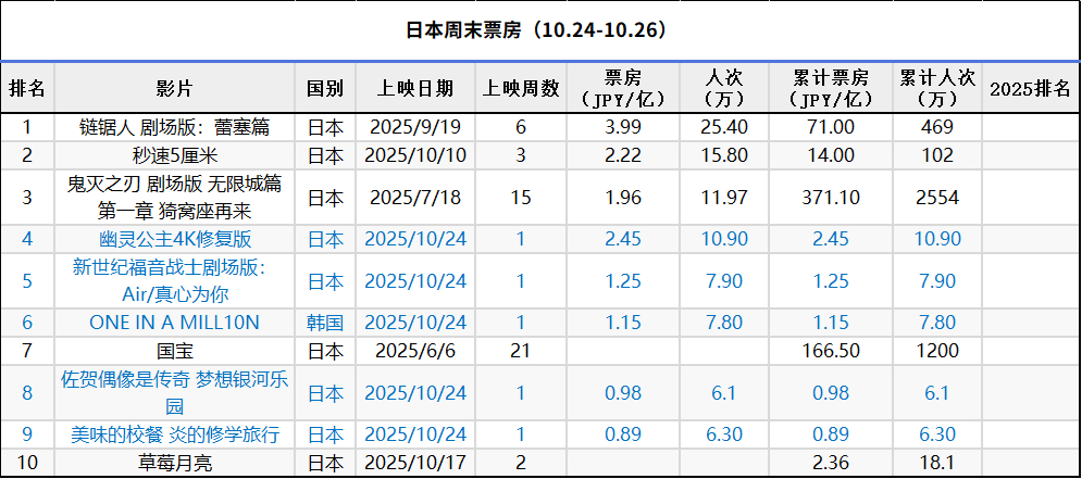 1.《链锯人 剧场版:蕾塞篇》六连冠,累计票房超70亿日元;
