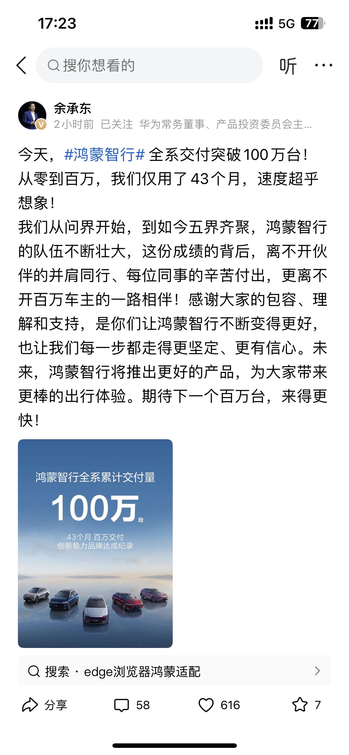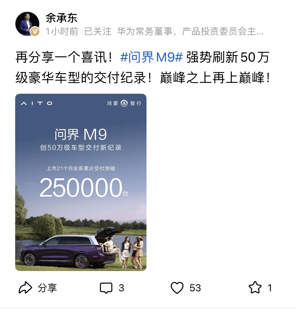 余承东:问界M9强势刷新50万级豪华车型交付记录! 问界M9上市21个月累计交付25万台。 月均交付11904台。 巅峰之上再上巅峰! 另外 华为系全系交付突破100万台! 从零到百万,仅用了43个月,速度超乎像想象!
