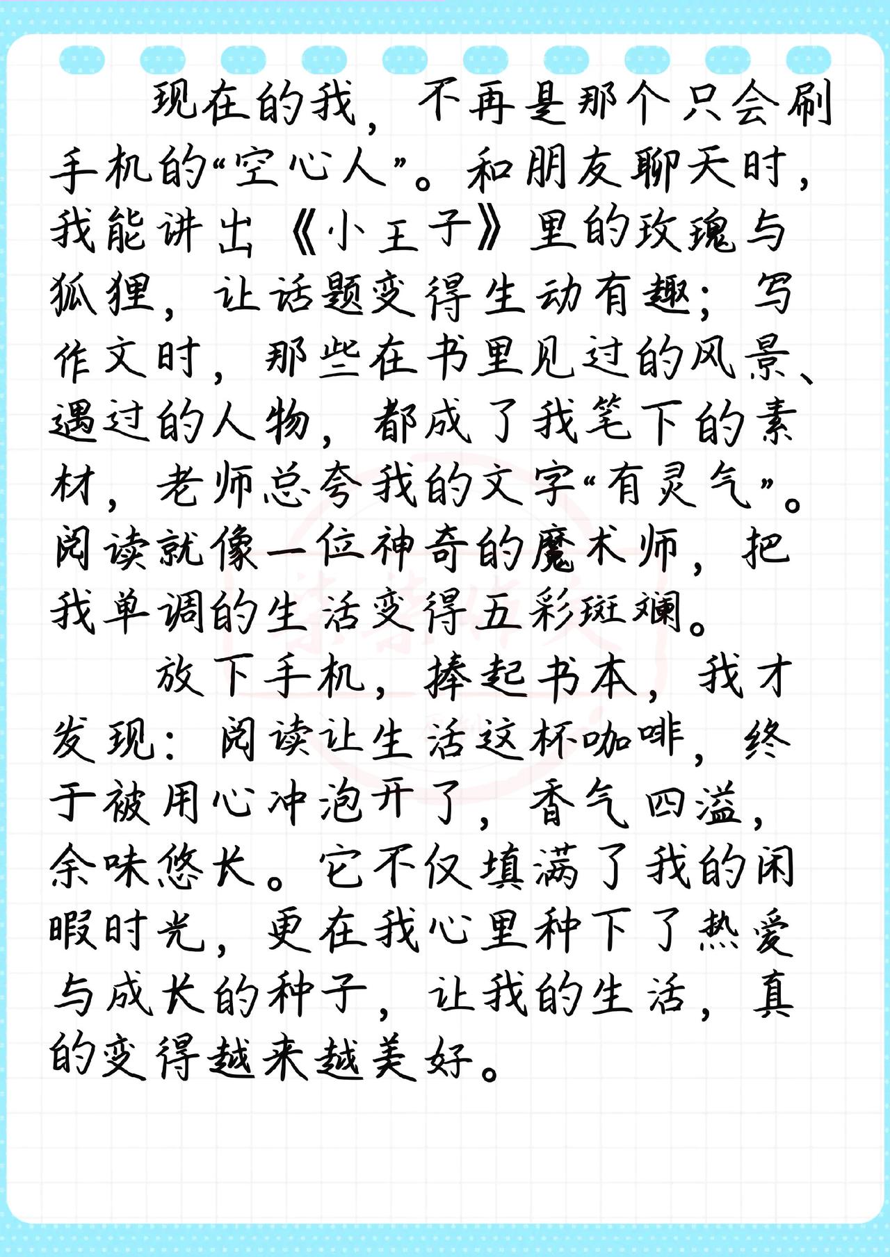 什么让生活更美好作文六年级上册第3单元作文:放下手机,捧起书本,我才发现:阅读让生活这杯咖啡,终于被用心冲泡开了,香气四溢,余味悠长。作文素材 作文素材积累 作文范文 优秀作文