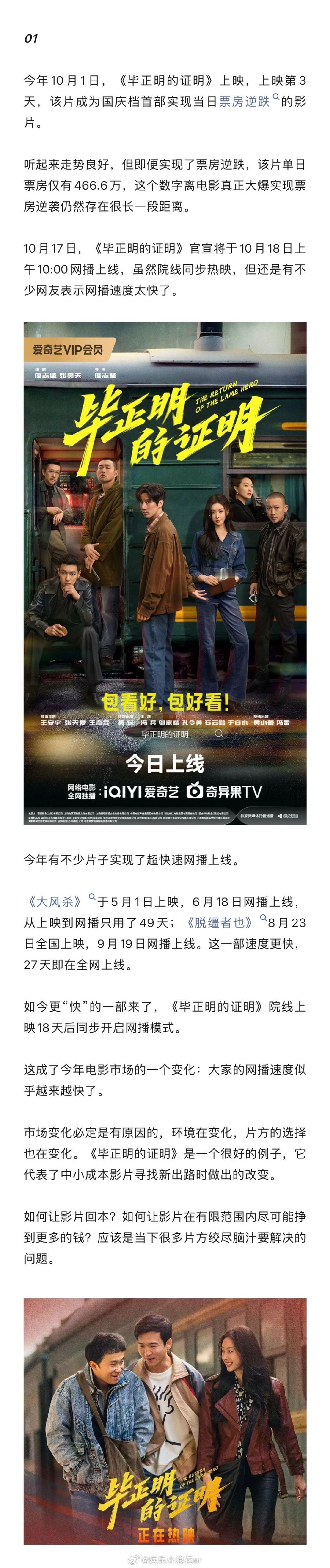 超快网播上线能救中小成本电影吗 毕正明的证明 网播分账票房成绩 《毕正明的证明》紧跟《大风杀》《脱缰者也》的脚步,18天院线转网播,9天分账超千万。这得益于爱奇艺5月推出的新规:院线上映90天内可网播分账,按观看时长计酬。可甜头背后也有隐忧:《毕正明的证明》靠前期口碑和平台推流才起量,若影片质量不过关,观众可以随时弃片,观众话语权更大,自由度更高。↓