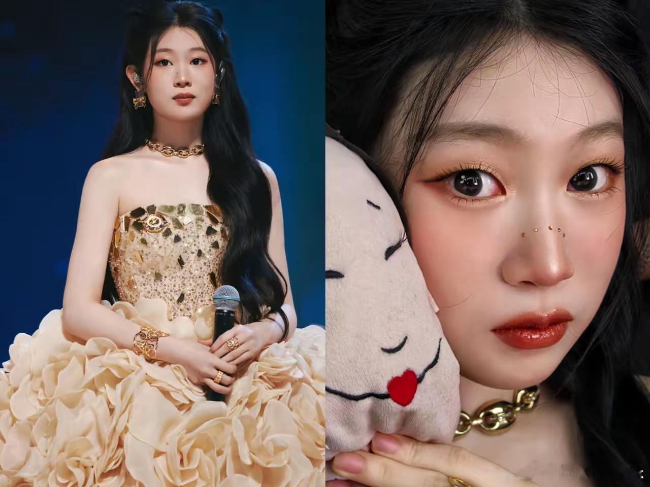 ​惊讶的是她这次的妆造也太好看了吧!全身金闪闪的,还扎着一个猫咪公主头发,看起来也太乖太可爱了。