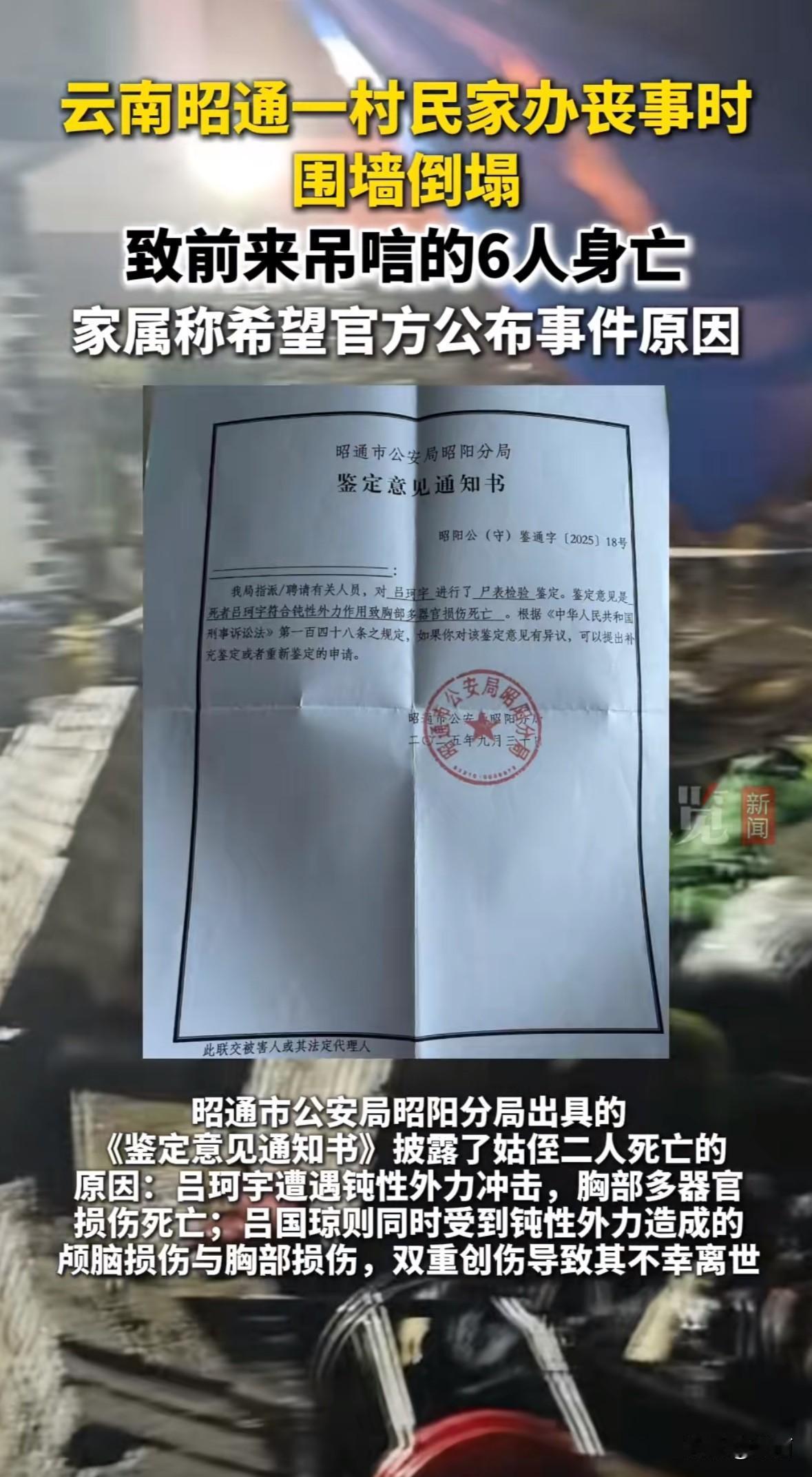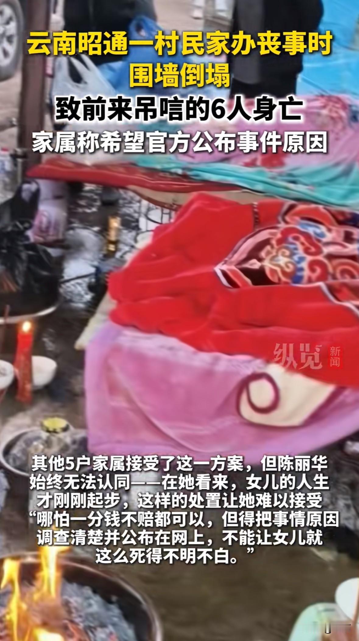 9月10日下午,昭通昭阳区守望乡一村民办丧事时,院围墙突然倒塌,砸中就餐人群致6人死亡。目击者说当时下大雨,丧主搭的篷布没做好排水,积水太重用绳索拉倒了围墙。警方鉴定部分死者是钝性外力致胸部多器官损伤死亡。 事后政府协调补偿,丧主赔每位死者8万,政府补6.6万。现在5家家属接了方案,还有1家因没拿到调查处理报告不接受。 这事挺让人痛心,办丧事本是悲伤事,却因安全考虑不到位出了意外。按《民法典》,围墙管理人得担责,丧主没做好篷布排水是直接原因。赔偿得给,但调查报告也该及时公开,给家属明确说法。办红白事人多,安全细节真不能马虎。