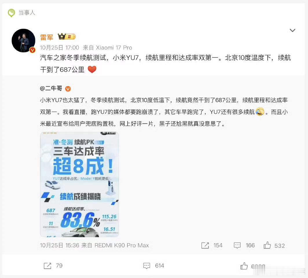 雷军回应第三方冬测数据有没有小字 小米YU7 10度天气下 续航干到687公里,网友问有没有小字,雷总回复表情包[doge][doge][doge][doge][doge]