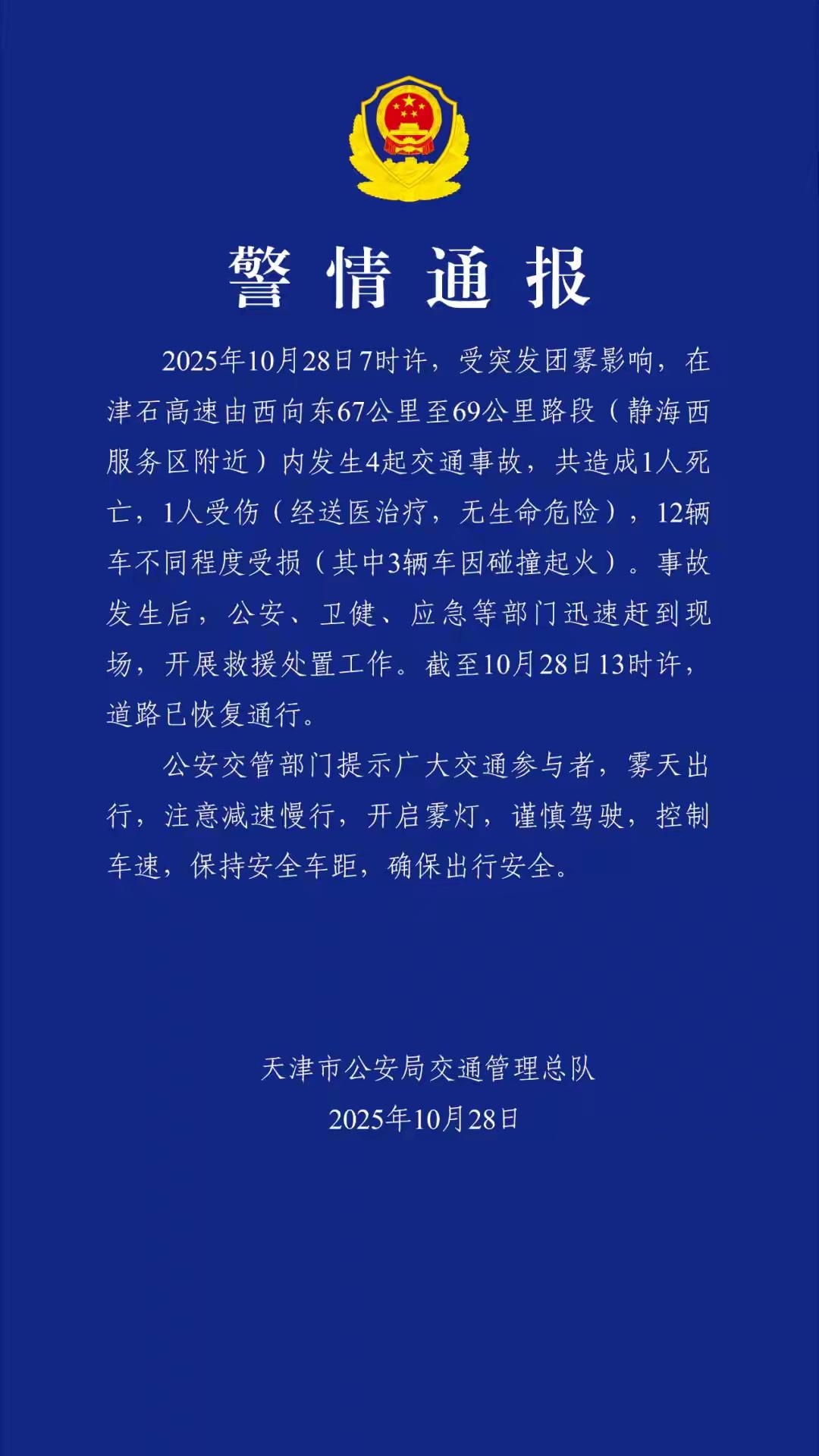 天津警方通报28日津石高速交通事故,4起事故,致1死1伤,12辆车受损,其中3辆起火。事故起因受突发团雾造成。据天气预报,今晚到明天,京津冀大部地区还将有大雾天气,请广大司机注意打开雾灯、示廓灯谨慎慢行。热点 警方通报津石高速交通事故 团雾引发津石高速交通事故致1死1伤