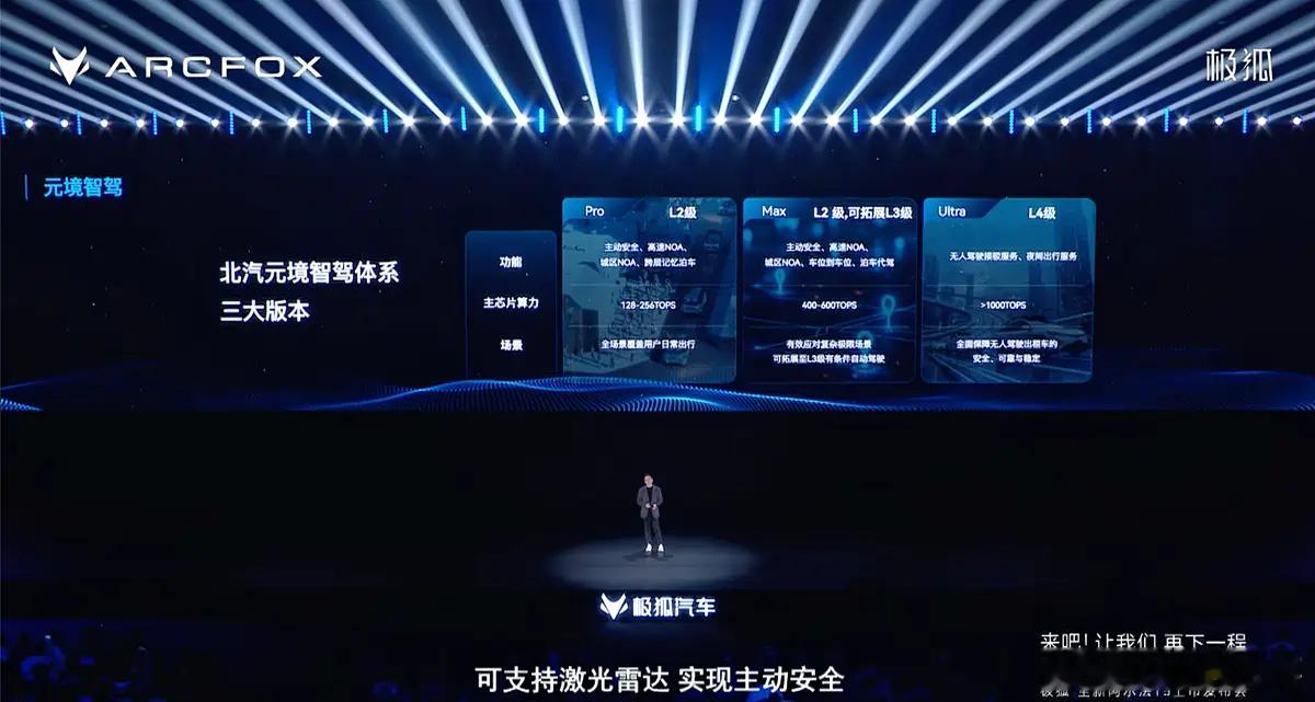 这套北汽极狐的元境智能全域融合架构,囊括了驾舱融合、“跨生态”AI融合、“真实世界与虚拟世界”融合。基于此打造了元境智驾和元境智舱,其中元境智驾有Pro/Max/Ultra三个版本,分别对应L2+的端到端城区领航、L3车位到车位领航以及L4自动驾驶