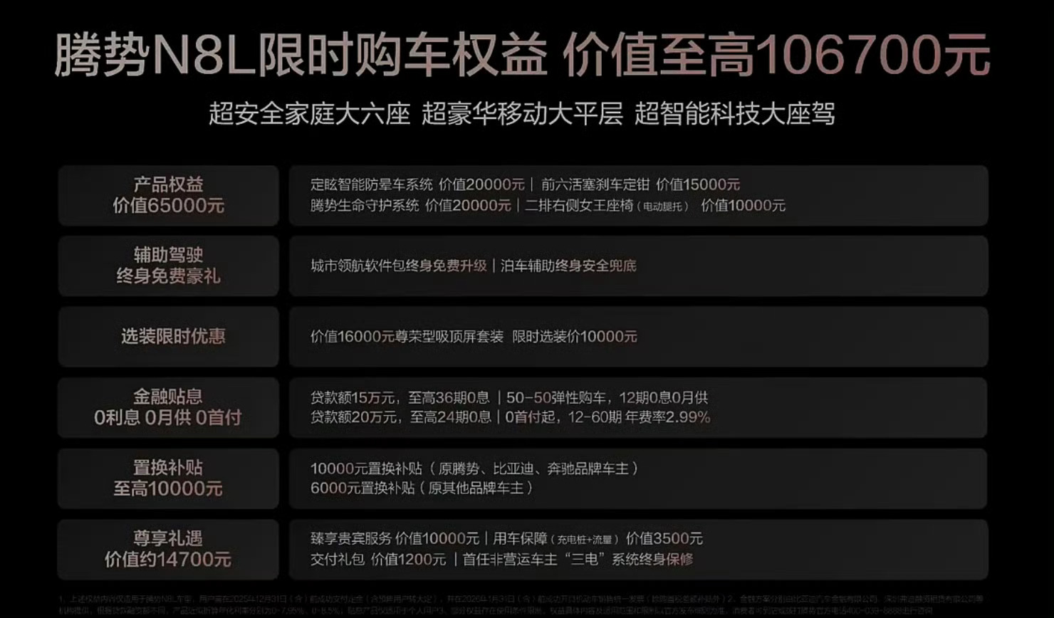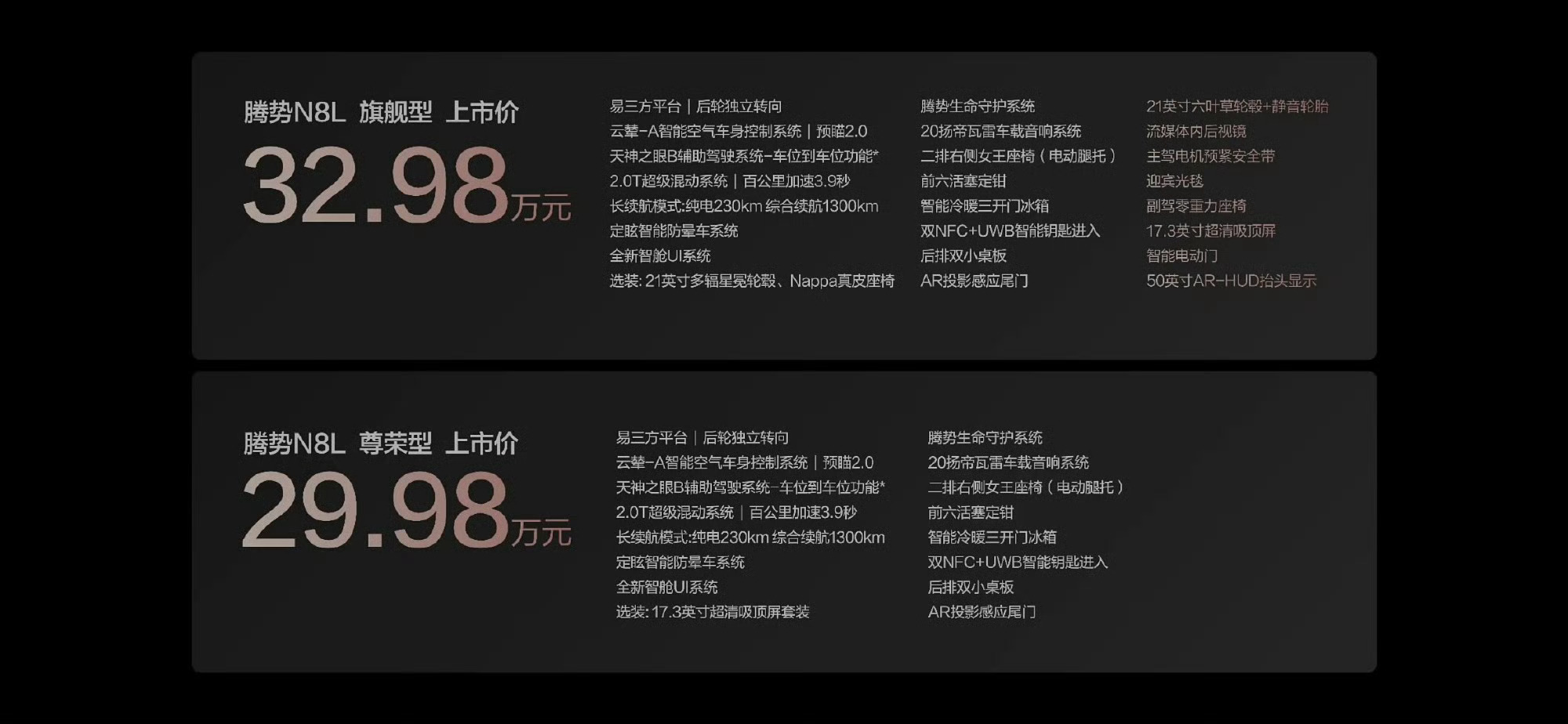 10月28日腾势N8L 正式上市,2款车型定价29.98万-32.98万元,作为大六座SUV首选腾势N8L29.98万起的车型,它主打的越级价值终极满足,刚好让自己成了一台家人全票通过的车。