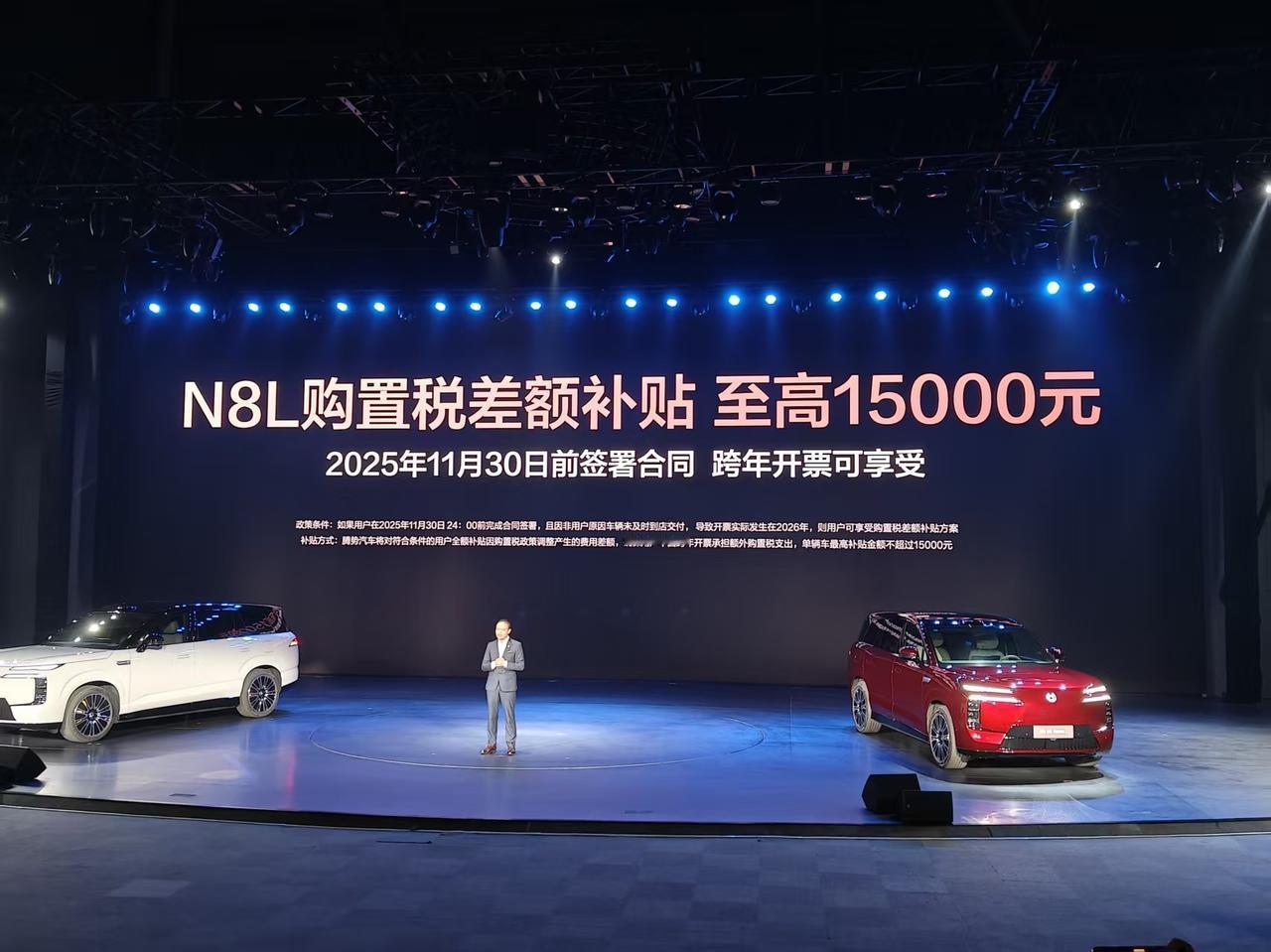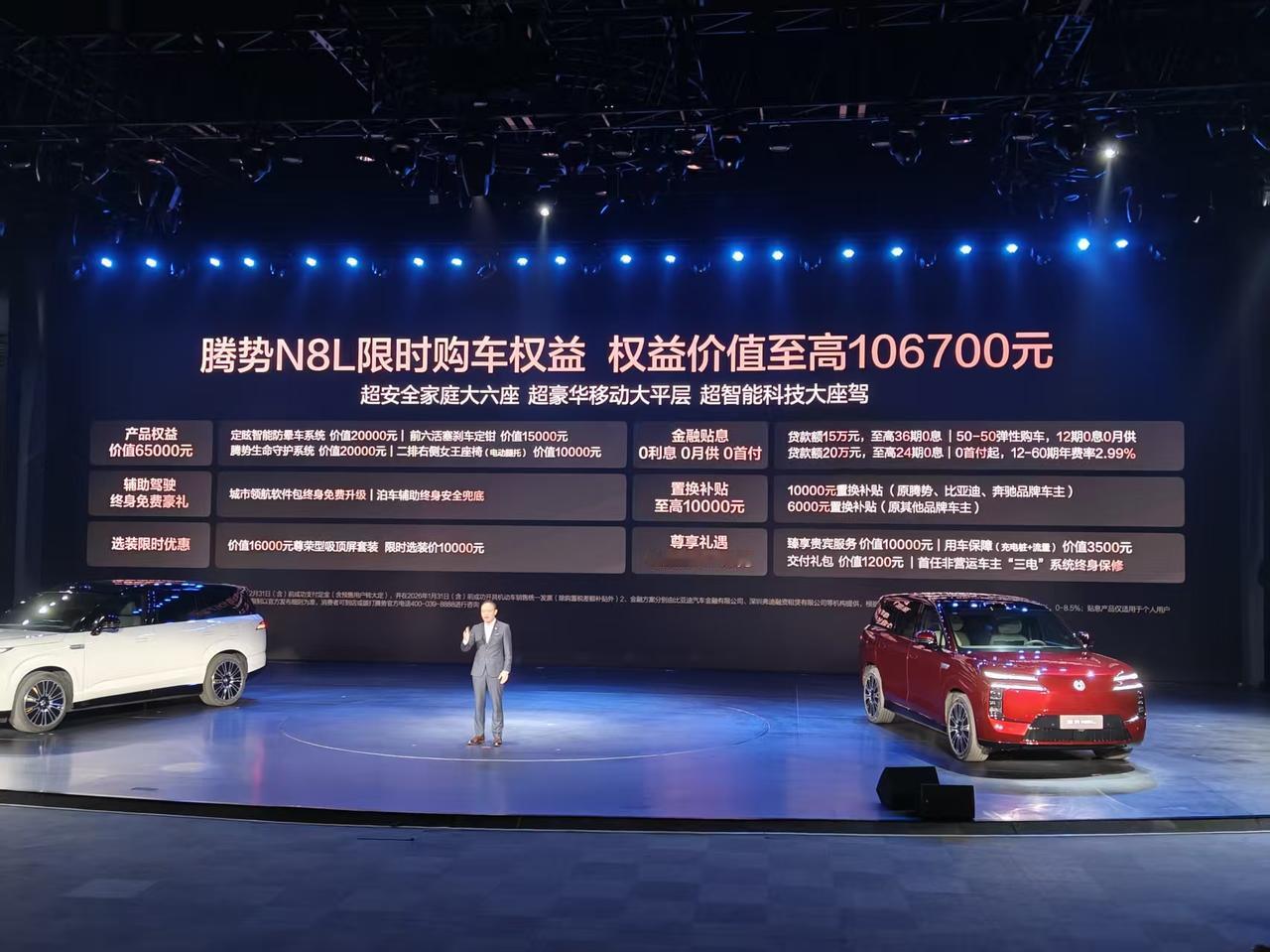 车盟快讯:10月28日,大六座安全豪华SUV腾势N8L正式上市,共推出2款车型,官方指导价29.98万元-32.98万元,全系标配易三方、云辇-A智能空气车身控制系统、2.0T超级混动(零百加速3.9秒,CLTC纯电续航230km/综合续航1300km)、天神之眼B辅助驾驶激光版、定眩智能防晕车系统,还拥有5200*1999*1820mm越级尺寸(三排均宽敞,人均超1㎡,49处储物+51L隐藏后备厢),现在购车享限时至高10.67万元权益(含三年免息、最高1万元置换补贴),2025年11月30日前完成合同签署若因非用户原因跨年开票,还可享至高1.5万元购置税差额补贴,尊荣型17.3英寸超清吸顶屏套装限时选装优惠,在30万级家庭豪华大六座SUV中,能让宝爸享驾控、宝妈从容开停、孩子不无聊、老人轻松舒展的腾势 N8L,作为家庭用户的你是否也动心了?
