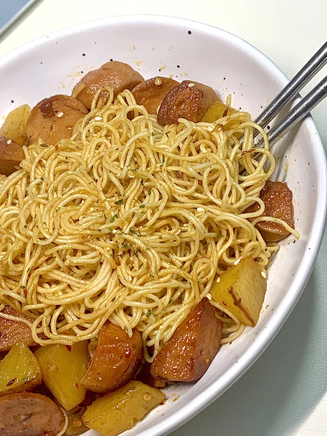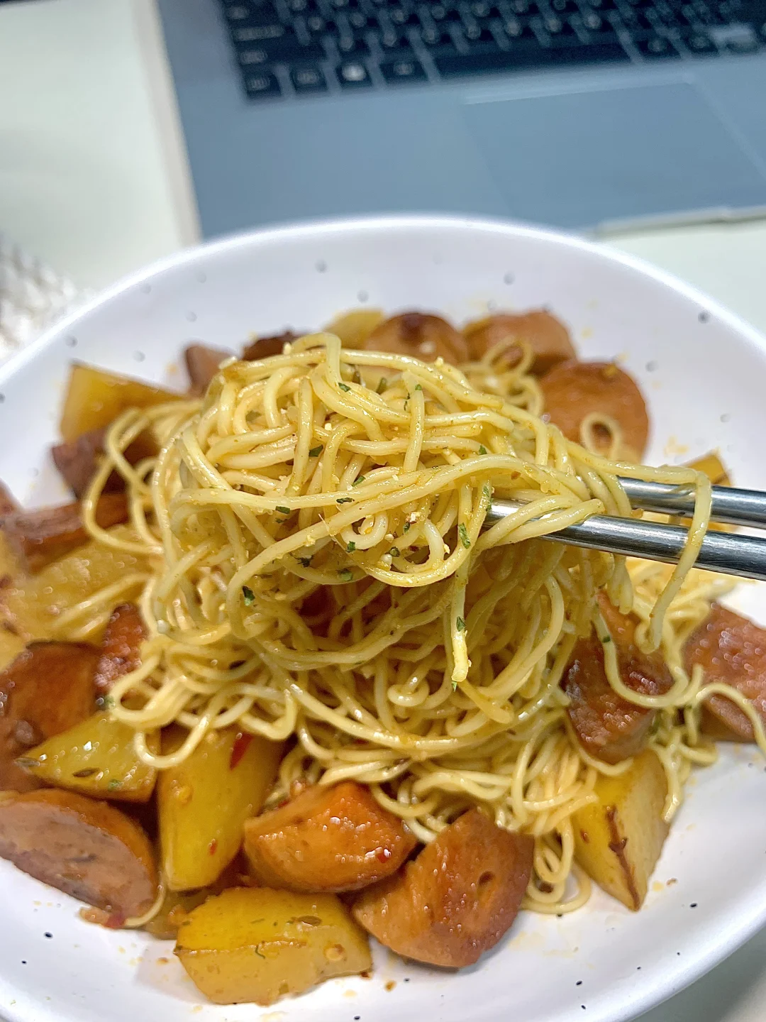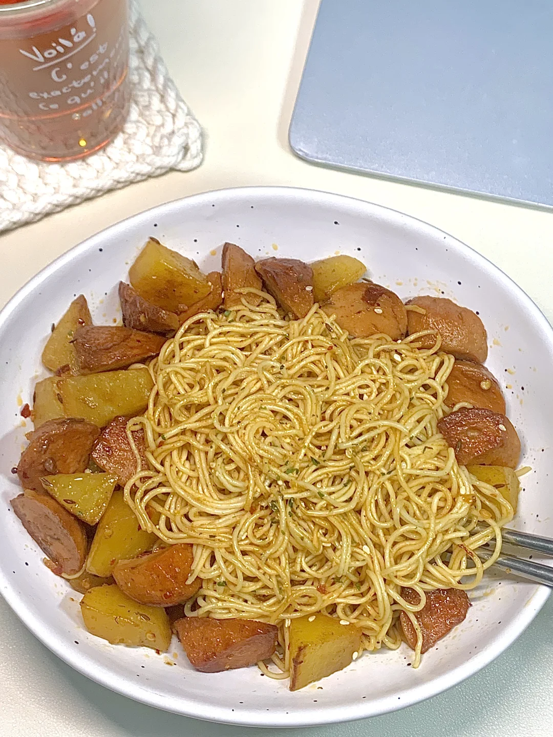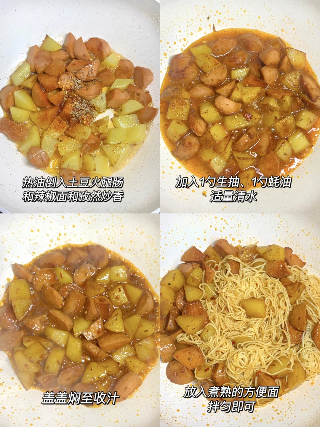 ☀️哈喽,大家好呀!今天分享快手又美味的土豆火腿拌面!简单食材吃出幸福感,听我的一定要试试喔,土豆软糯,面条裹满了孜然的香味真的绝了😋😋 🍳🍳食材: 方便面一包,土豆半个,火腿肠一根 🧑🏻🍳🧑🏻🍳做法:如图所示~ 真的巨巨巨好吃哦~ 姐妹们一定要试试呀!