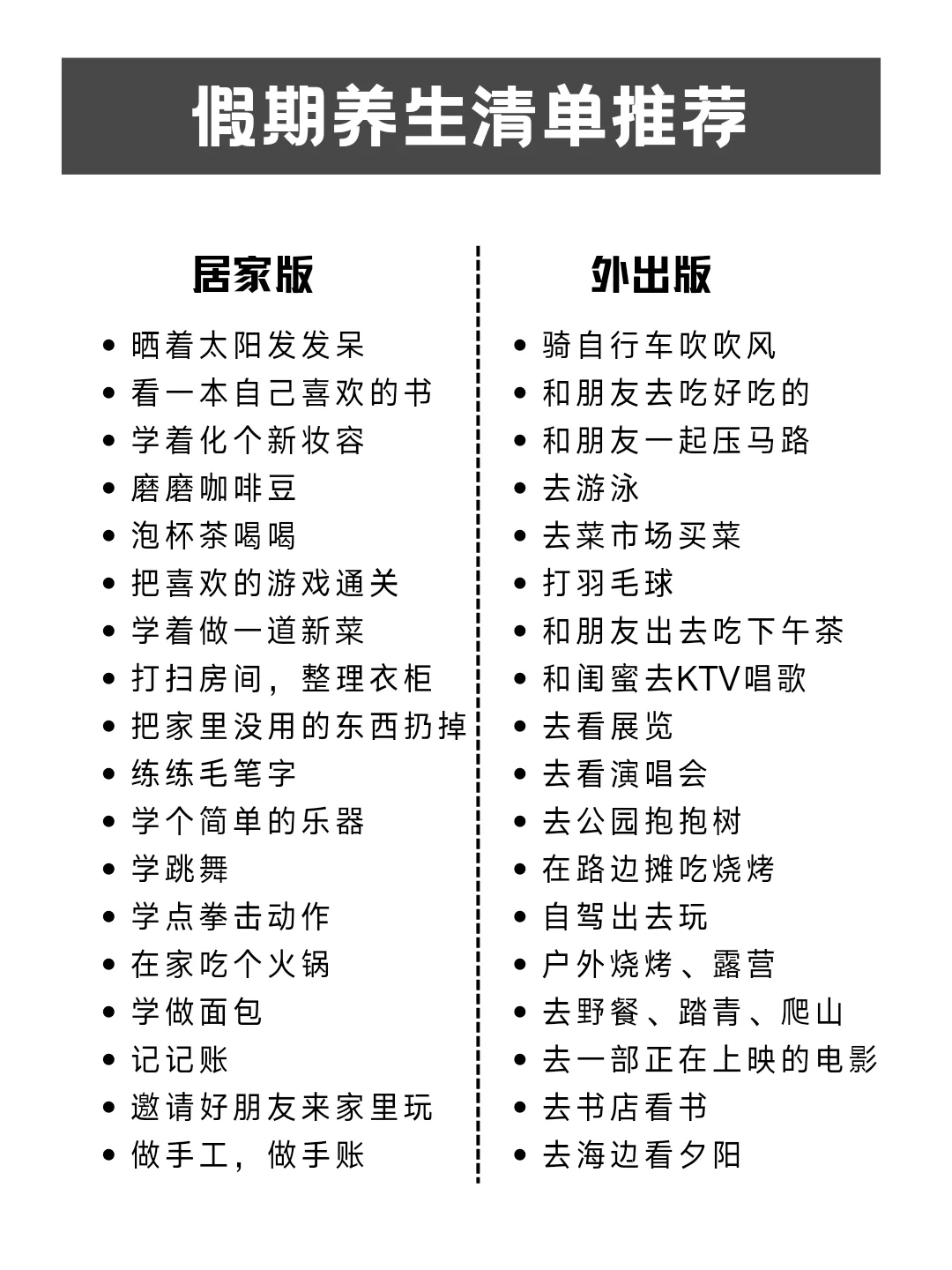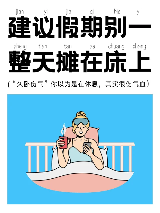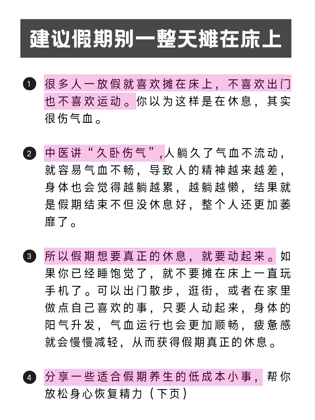 很多人一放假就喜欢摊在床上,不喜欢出门也不喜欢运动。你以为这样是在休息,其实很伤气血。 中医讲“久卧伤气”,人躺久了气血不流动,就容易气血不畅,导致人的精神越来越差,身体也会觉得越躺越累,越躺越懒,结果就是假期结束不但没休息好,整个人还更加萎靡了。 所以假期想要真正的休息,就要动起来。如果你已经睡饱觉了,就不要摊在床上一直玩手机了。可以出门散步,逛街,或者在家里做点自己喜欢的事,只要人动起来,身体的阳气升发,气血运行也会更加顺畅,疲惫感就会慢慢减轻,从而获得假期真正的休息。