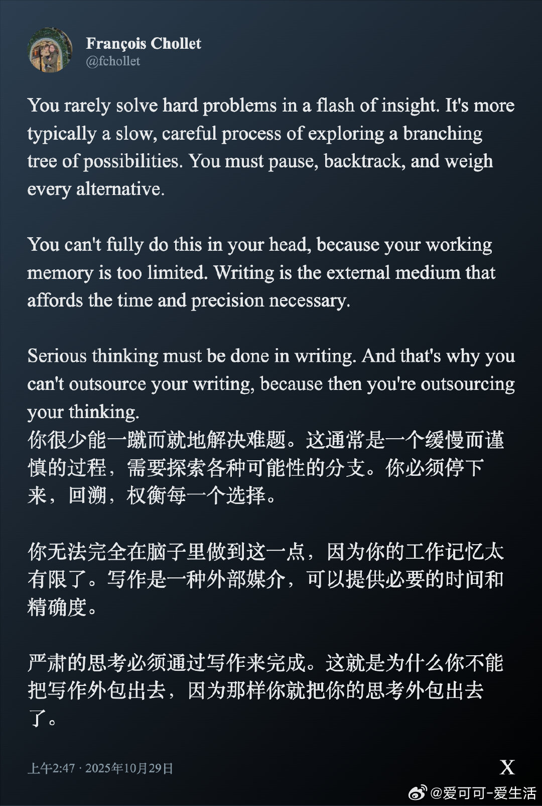 François Chollet:你很少会凭借灵光一现解决难题。解决复杂问题,往往是缓慢且细致的过程,需要不断探索各种可能性,停下来反思、回退并权衡每个选项。由于工作记忆有限,这些思考无法完全在脑中完成,写作成为了外部媒介,给予我们时间和精度去理清思路。