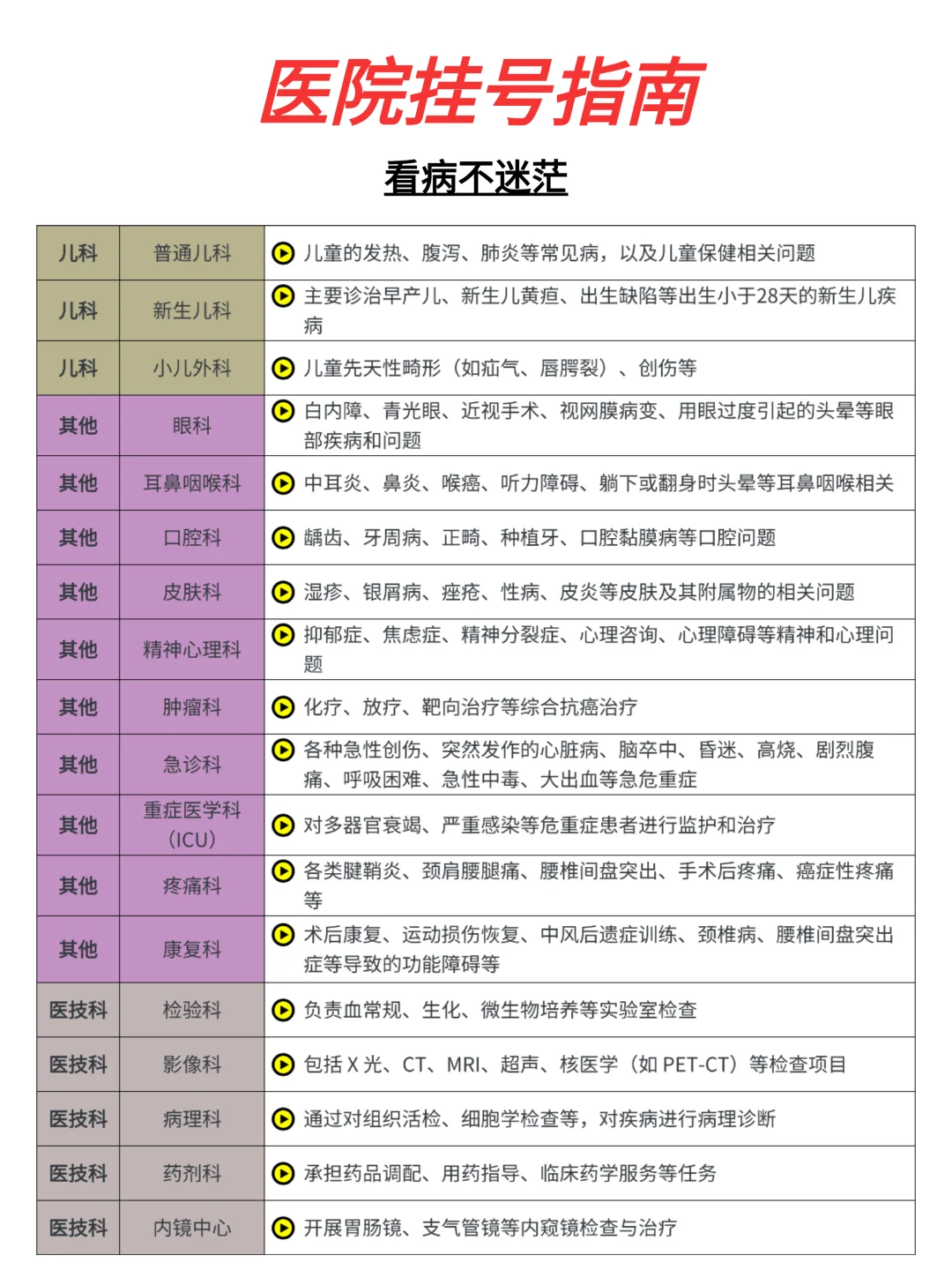 宝子们,你们是否也曾站在医院大厅,面对密密麻麻的科室名称感到迷茫😳?头痛到底该挂神经内科还是神经外科?胃痛是消化内科还是普通外科?别急,这份指南帮你解决! ⭕内科:呼吸、心血管、消化、神经、肾内、内分泌、血液、风湿免疫…… ⭕外科:普外、骨科、神外、心胸外、泌尿外、整形外、乳腺外…… ⭕儿科:普通、新生儿、小儿外…… ⭕妇科:妇科、产科、生殖医学…… ⭕医技:眼、耳鼻喉、口腔、皮肤、精神、肿瘤、急诊、重症、疼痛、康复…… ⭕其他:检验、影像、病理、药剂……