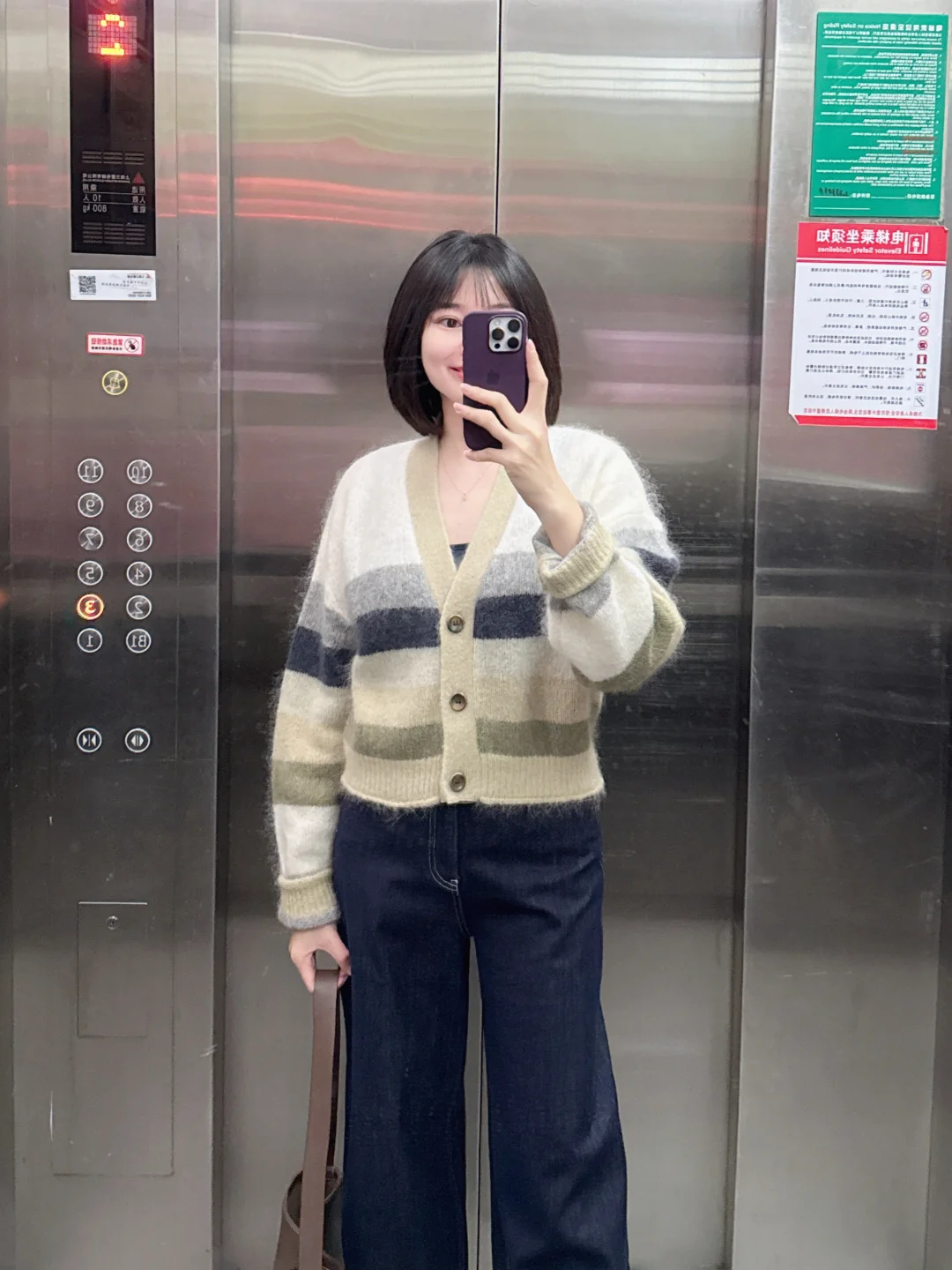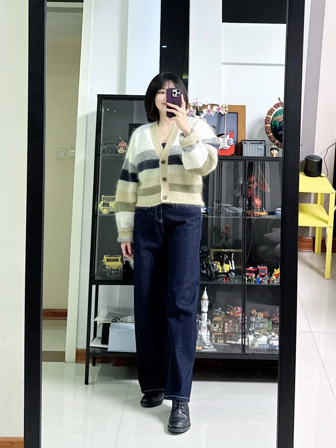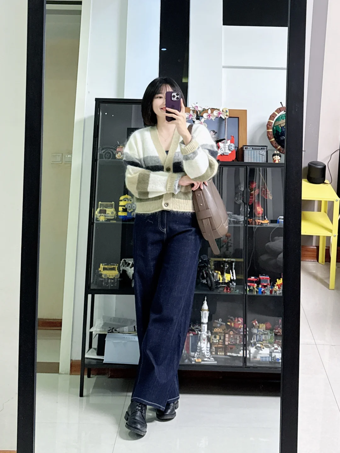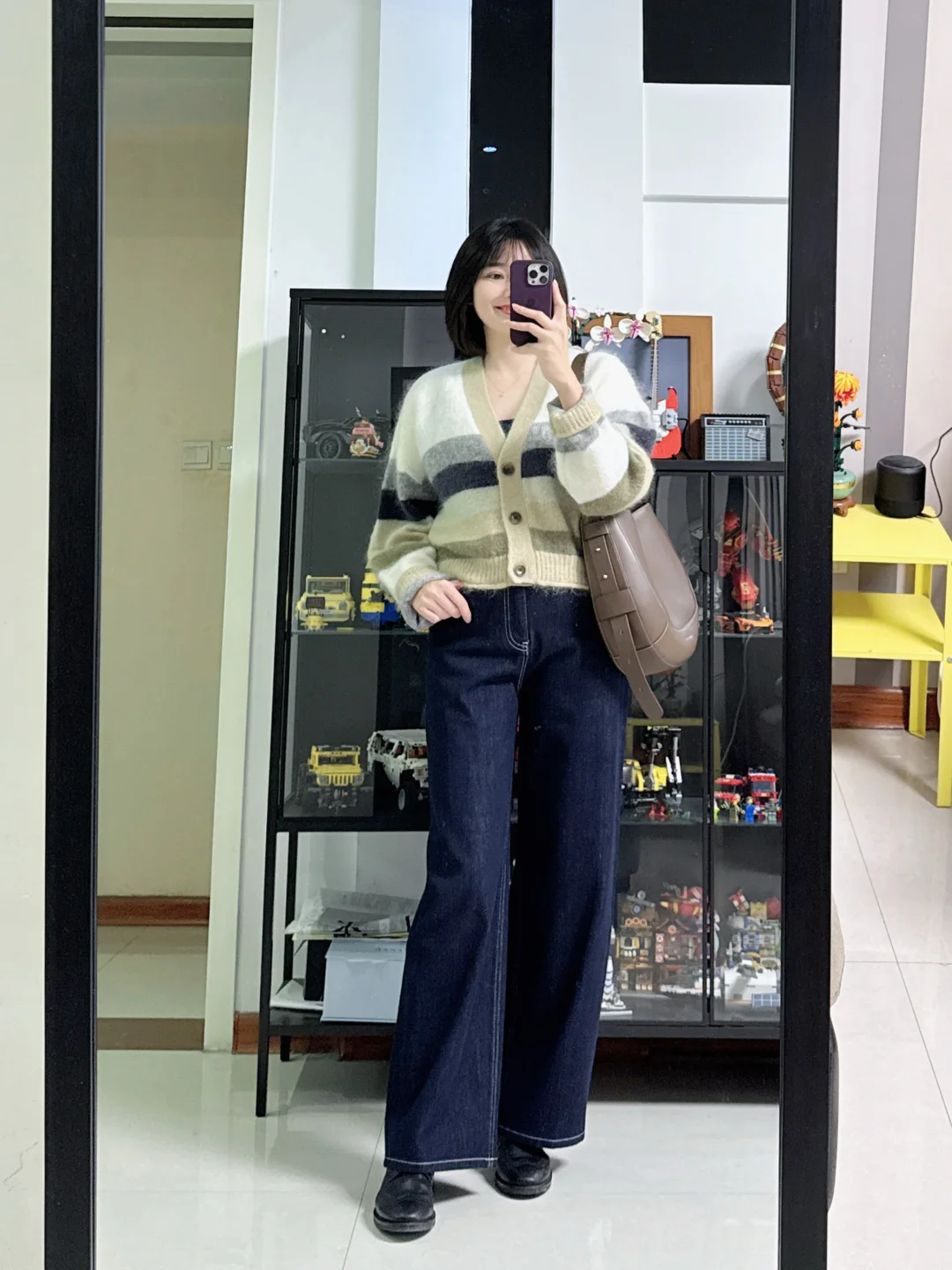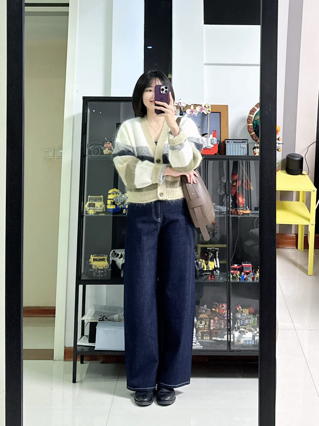 🍂羊毛开衫搭配牛仔长裤,洋气的条纹配色,和原色牛仔,都是我喜欢的风格,简单舒适。