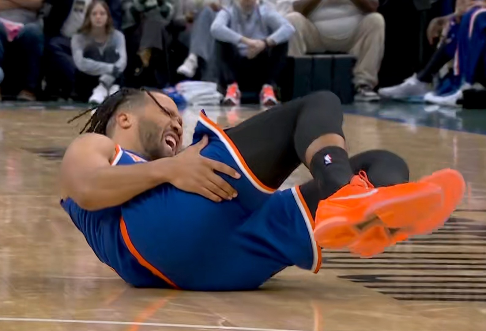 NBA纽约尼克斯布伦森看上去右腿拉伤了……但暂停回来又回到赛场!真硬汉!