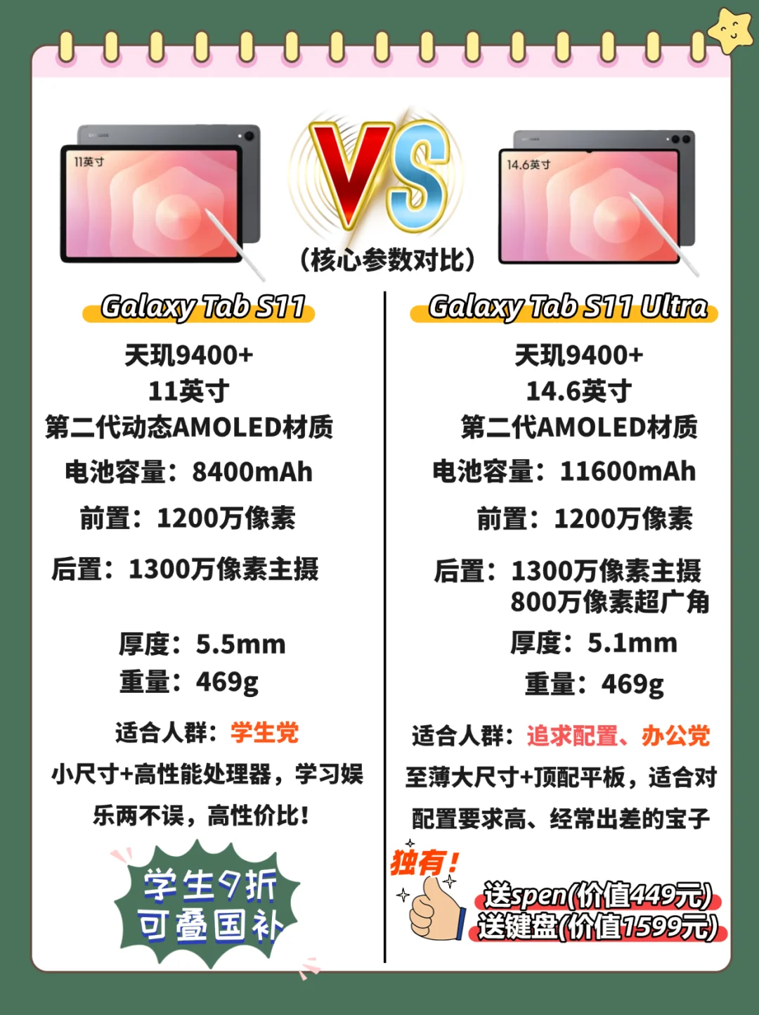 [棒R]同时想入手平板的宝子建议搭配三星S11系列平板,现购三星S11平板学生享9折,还可叠加国补使用,😍而购入S11 Ultra平板还送价值449元的spen以及1599元的键盘(独家福利哦,而其他家需要额外购入!)