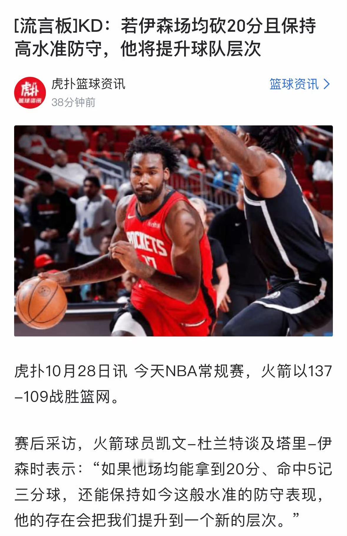 笑死我了,火箭队内氛围太好了。 杜兰特:若伊森场均得20分、命中5记三分且保持高水平的防守表现,这会让我们球队的实力再上一个台阶。 伊森:若杜兰特保持场均50分且有10个以上助攻,我们将夺冠。
