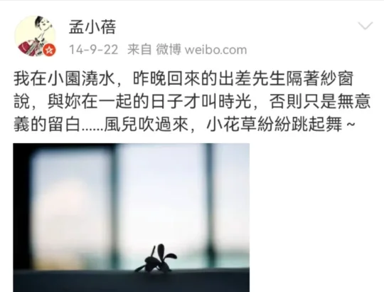 “我在小园浇水,昨晚回来的出差先生隔着纱窗说,与你在一起的日子才叫时光,否则只是无意义的留白......风儿吹过来,小花草纷纷跳起舞”