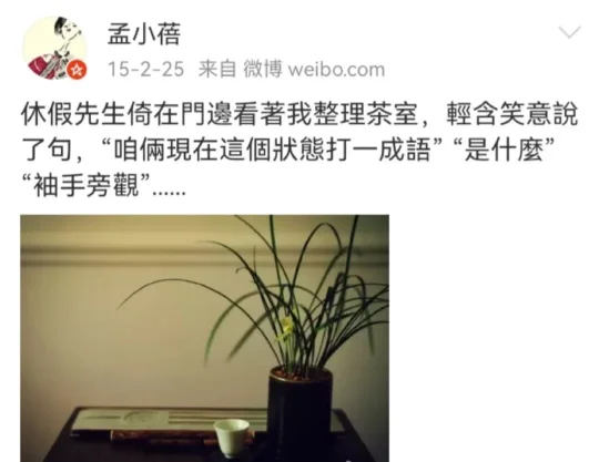 “休假先生倚在门边看着我整理茶室,轻含笑意说了句“咱俩现在这个状态打一成语” “是什么 ”“袖手旁观”
