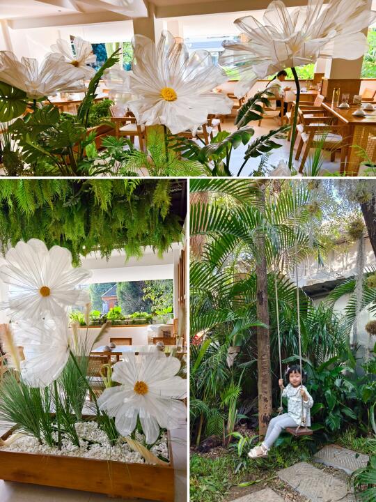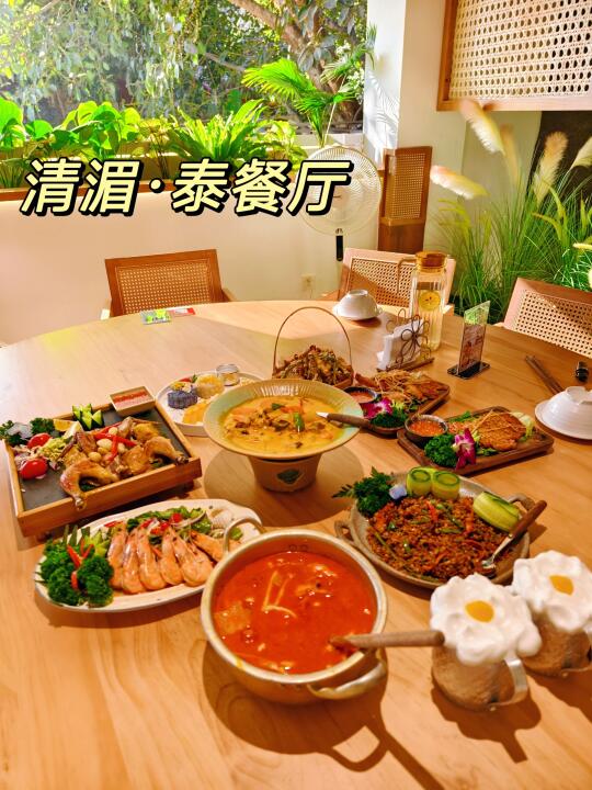 两层泰式小楼到处装点着白色雏菊,美绝了🥹一楼小院有个秋千,走的是森林风;二楼窗边的风景更是迷人,黄昏时分氛围感拉满。人均不到一百就可以吃到一顿漂亮饭!