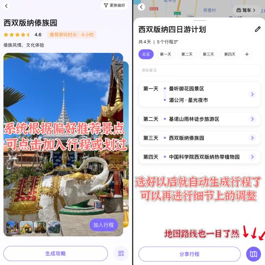 ⬆️以上的行程规划、路线图等都是一键生成的。输入目的地和天数,系统就会根据喜好推荐景点和行程,包括美食推荐、出行建议,甚至网红打卡机位都标的清清楚楚, biu的一下就给安排的明明白白😂(图8、9)