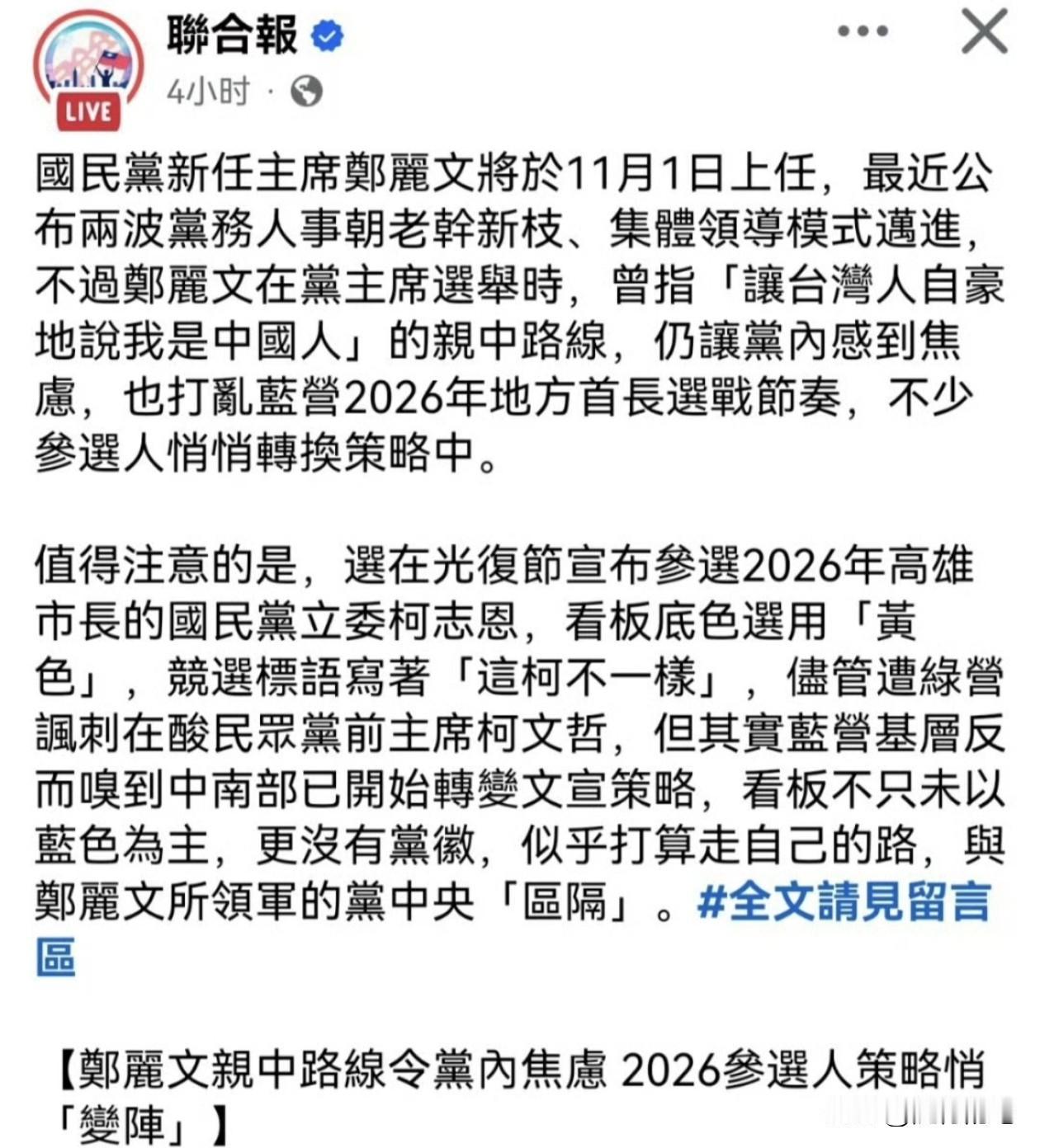柯志恩要与郑丽文做区隔? 柯志恩作为国民党的亲美派,多次公开对郑丽文的两岸政策表示质疑,并且要郑丽文作出调整。虽然竞选期间表态过对郑丽文的支持,但是显然柯志恩在两岸路线上与郑丽文分歧颇大,所以明年柯志恩在高雄的竞选被认为要与郑丽文做区隔,表现在近日柯志恩的竞选海报完全没有国民党的颜色元素,有“另起炉灶”的意味。 其实,柯志恩与郑丽文私下并没有什么矛盾,而且郑丽文也公开表态过支持柯志恩在高雄明年县市长的竞选。但是显然俩人表面上的和睦掩盖不了双方各自两岸关系的路线分歧,可能这是导致柯志恩有意区隔郑丽文的主要原因。