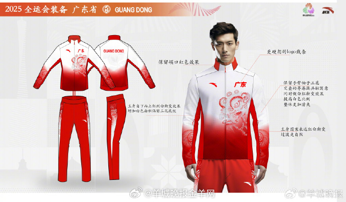 据介绍,领奖服以红白渐变为图案基底,把广东省独特文化元素舞龙舞狮中的“醒狮”形象与全运会主视觉标识的烟花设计做结合,既有广东文化的审美特色,又寓意广东省代表团对本次全运会比赛全力以赴,再创佳绩。