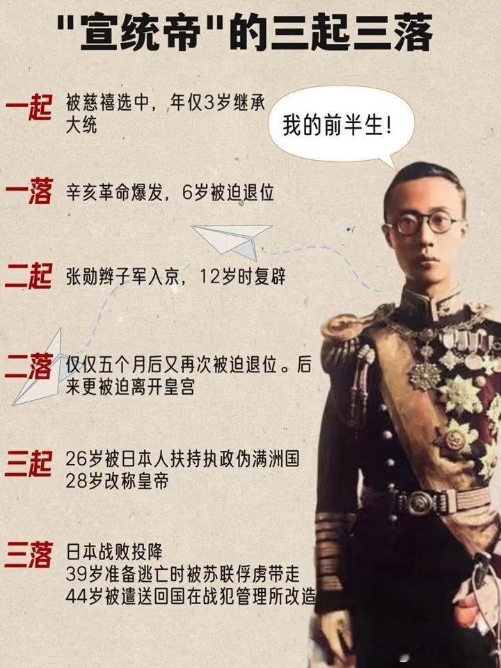 主要功绩:一生三次登基,三次退wei(1908年,3岁即位 | 1912年,在辛亥革命浪潮中退wei | 1917年,被北洋军阀张勋拥立复bi,仅12天再次退wei | 1934年,在日本关东军扶植下,成为伪“满洲国”的“皇帝”);晚年成为守法公民,著书立说,撰写了自传《我的前半生》,成为了解晚清宫廷生活、民国动荡以及伪满历史的第一手珍贵史料;1959年12月被te赦,成为中华人民共和国的一名普通公民;公元1967年,因尿毒症病逝于北京;溥仪是中国历史上一位绝无仅特的悲剧性人物,跨越了皇帝、傀儡、战犯和公民等多个身份。
