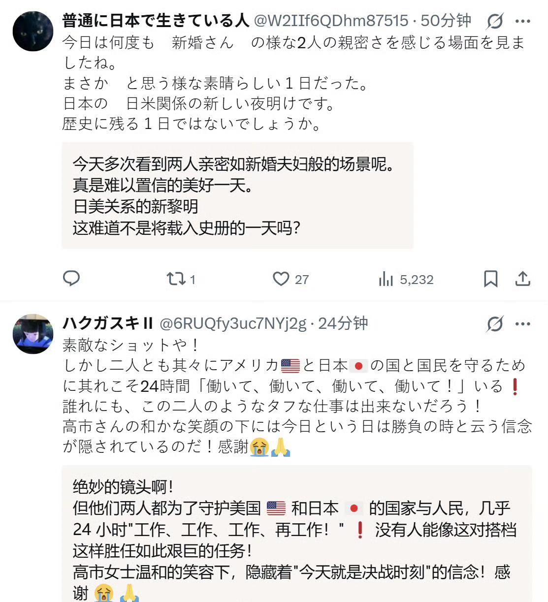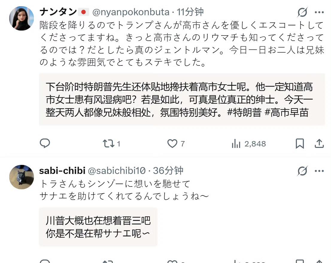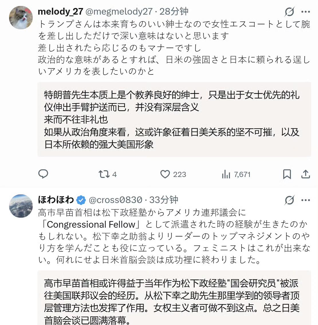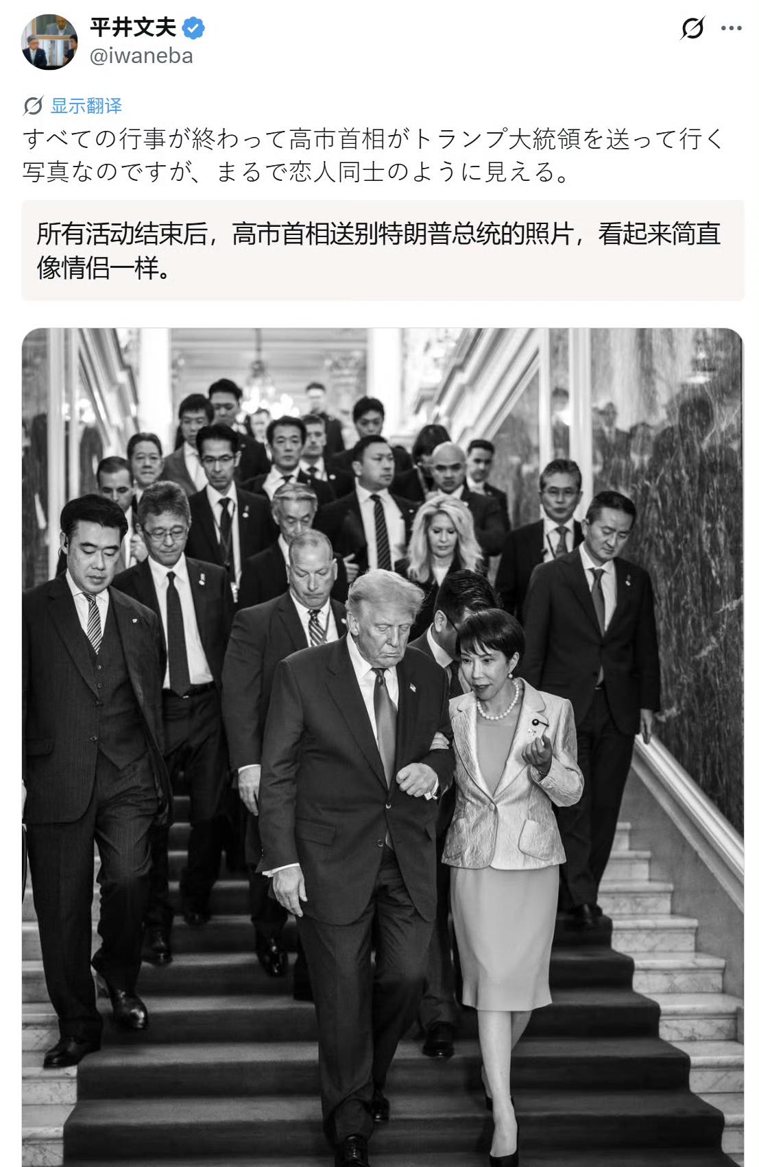 看看日本人对美国人有多谄媚、 高示挽着特朗普的手好像情侣,新婚夫妇般 第一次见到这种场景还是感到吃惊的,作为国家首脑,理应该落落大方,搞得好像娱乐圈一样,和男人十指紧扣又是搭肩勾背,其他国家也有女性王储,也不像她这样那么爱动手动脚的