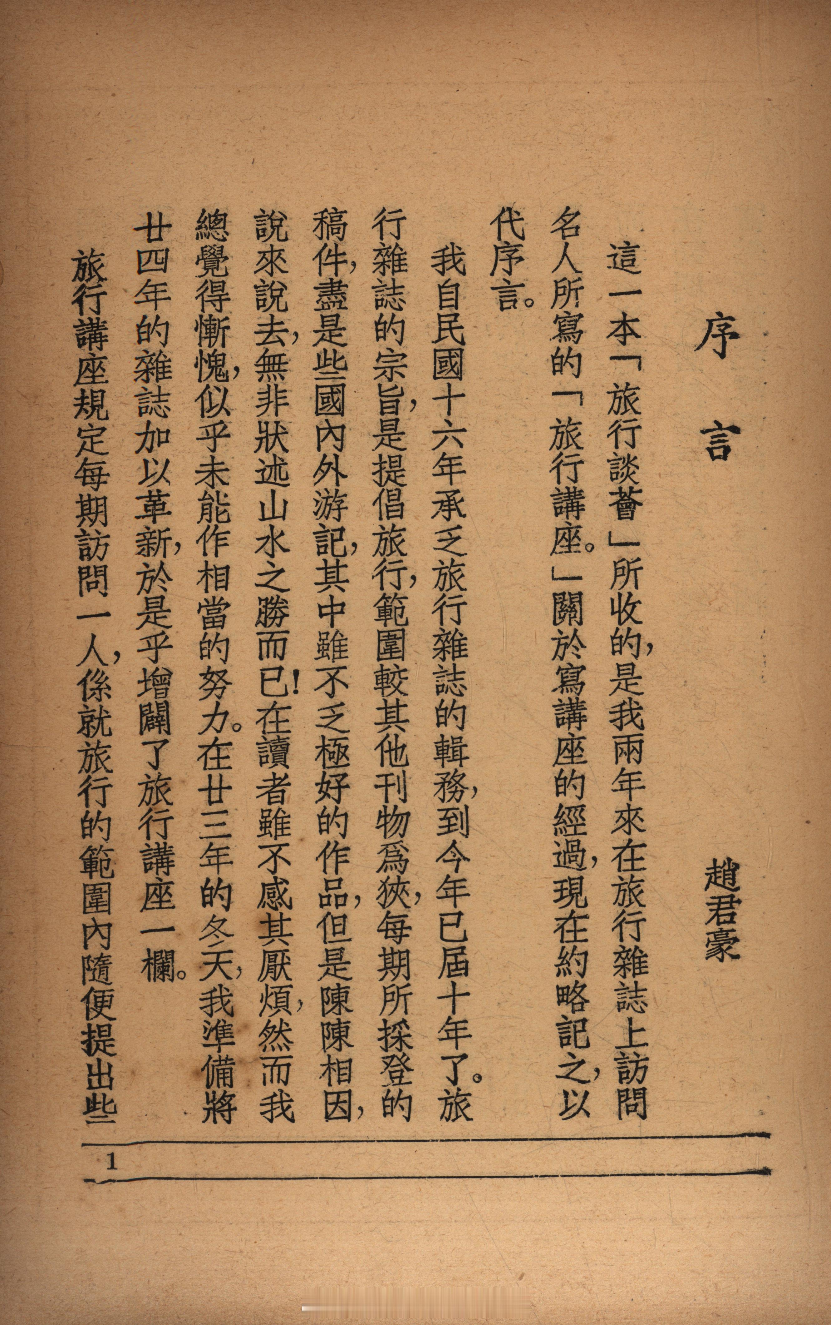 1935年起,赵君豪在《旅行杂志》中开辟旅行讲座专栏,每期刊载一篇名人访问记。采访的名人有马相伯、蔡元培、叶恭绰、顾维钧、潘公展、陈光甫等二十余人。所谈内容皆为名人旅行经历和感受。1937年,赵君豪将这些稿件重新整理并出版。