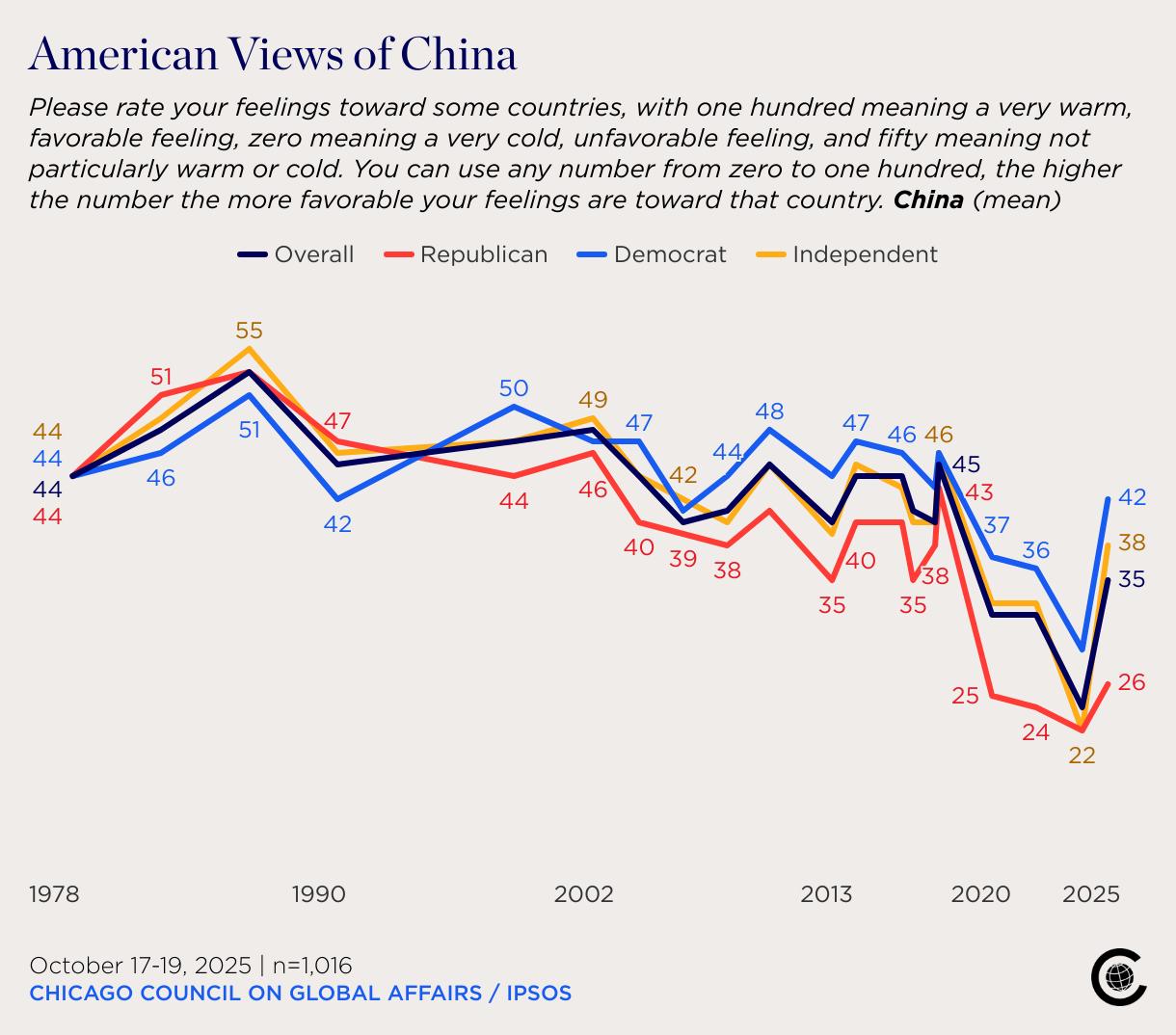 《Semafor》主编本·史密斯撰文称,随着中美在吉隆坡达成新的贸易框架协议,华盛顿长达十年的“对华鹰派时代”或将告终。该协议标志着美中关系显著降温,也象征着自特朗普2016年上台以来席卷华府的“反华共识”进入尾声。文章称,这一时期由两党鹰派智囊主导,从特朗普时期的博明、莱特希泽到拜登团队中的多位中国问题专家,他们推动美国与中国在关键领域脱钩,并将“新冷战”视为既成现实。史密斯指出,如今特朗普正“从自己开创、由拜登加剧的对抗中逐步退回”,回归一种“更接近商业常态的外交”,印证了柯立芝那句老话——“美国的事业就是商业”。他写道,在吉隆坡的谈判中,“助手们敲定了细节(芬太尼与TikTok、稀土与大豆),而领导人只需出席签署仪式”,显示特朗普式外交正趋于传统务实。前白宫中国事务官员杜如松批评称,美方“可能让北京占了上风”,而欧亚集团创始人伊恩·布雷默则警告,即便外交缓和,“人工智能趋势正成为去全球化的核心驱动因素”,两国理解与互联或将进一步削弱。 民调方面,芝加哥全球事务委员会(Chicago Council)最新调查显示,美国公众对华态度出现明显回暖,超过半数受访者(53%)支持以“友好合作与接触”为主的对华政策,而非遏制中国崛起。这一比例较2024年大幅上升13个百分点,标志着历时数年的两党对华“竞争共识”正在瓦解。民主党与独立选民的态度转变最为显著:66%的民主党人倾向合作,比去年上升19个百分点;共和党中仅有三分之一持相同观点。尽管共和党人仍主张限制中国影响并支持提高关税,民主党和独立派多数则反对加税,主张在中国缩减贸易逆差的前提下降低关税(支持率66%)。公众在“中美贸易是否削弱美国国家安全”上出现分歧:48%认为削弱,47%认为增强。报告还显示,美国人对华整体印象回升至疫情前水平,评分从2024年的24分升至35分,为2020年以来最高。其中,民主党人平均给出42分,独立选民为38分。 图片来源于网络