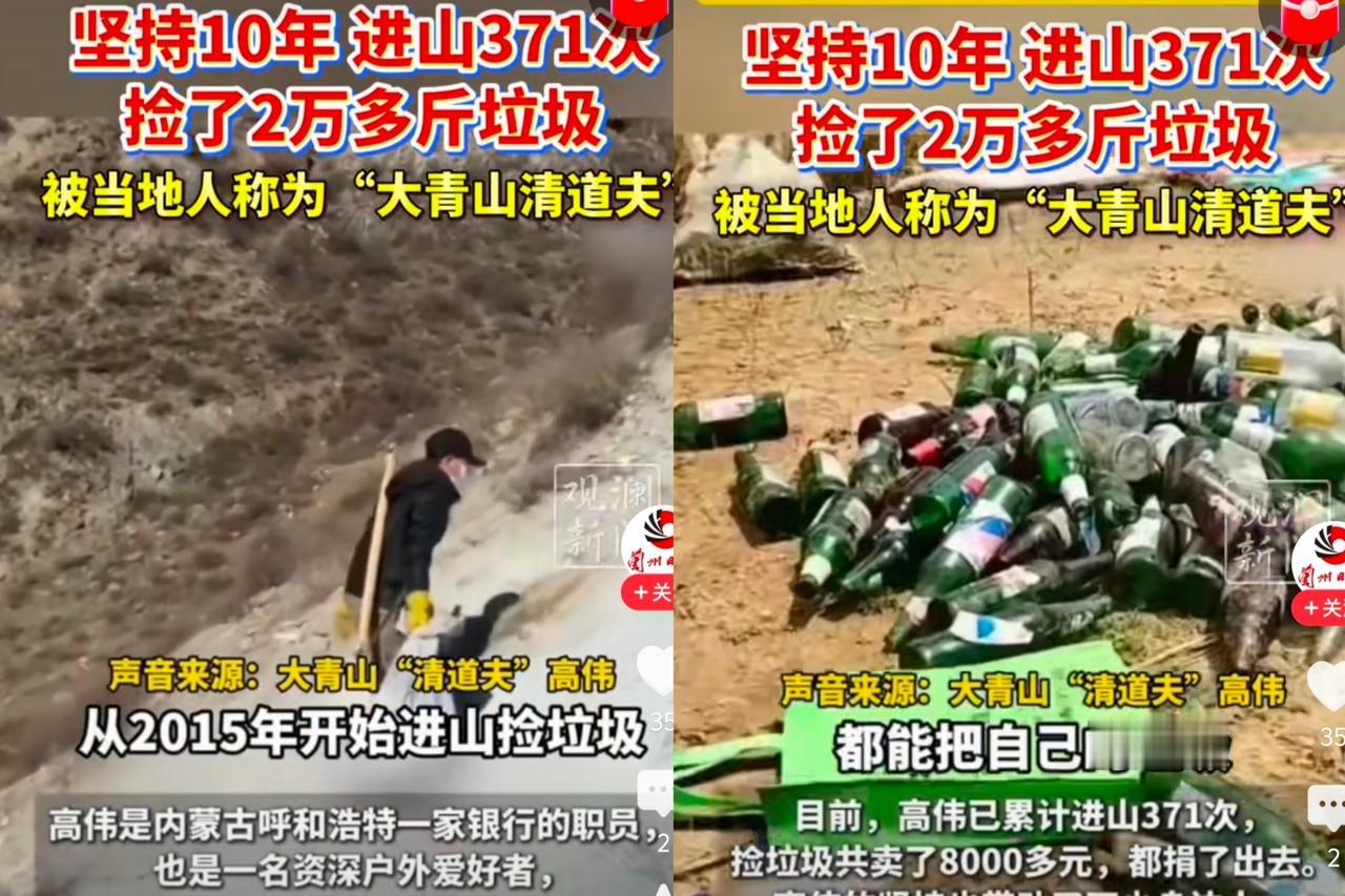 刚刚刷到一则新闻:呼和浩特银行职员高伟, 10年里利用节假日进山371次, 累计捡走饮料瓶10万多个、烧烤签11万余根,总重逾2.16万斤, 足迹遍布大青山南麓及周边百公里山区。还把卖废品的8000多块全捐了,连妻子都被他拉来一起当“山涧清道夫”。 这哪是“捡垃圾”,分明是用最实在的方式护着青山。现在好多环保宣传喊得响亮,可高伟偏不搞虚的,用一本本“垃圾账本”记录足迹,把普通人的力量攒成了守护山水的光。他没说过什么豪言壮语,却用371次进山的脚步证明:环保从不是大人物的事,每个人的小小坚持,都能让山更清、水更净。 比起空喊口号,高伟这样“做实事”的环保才更有力量。你身边有没有这样默默为环境做事的人?或者你自己,也想试试从随手捡垃圾开始吗? 万能生活指南正能量 捡垃圾 环保 清道夫