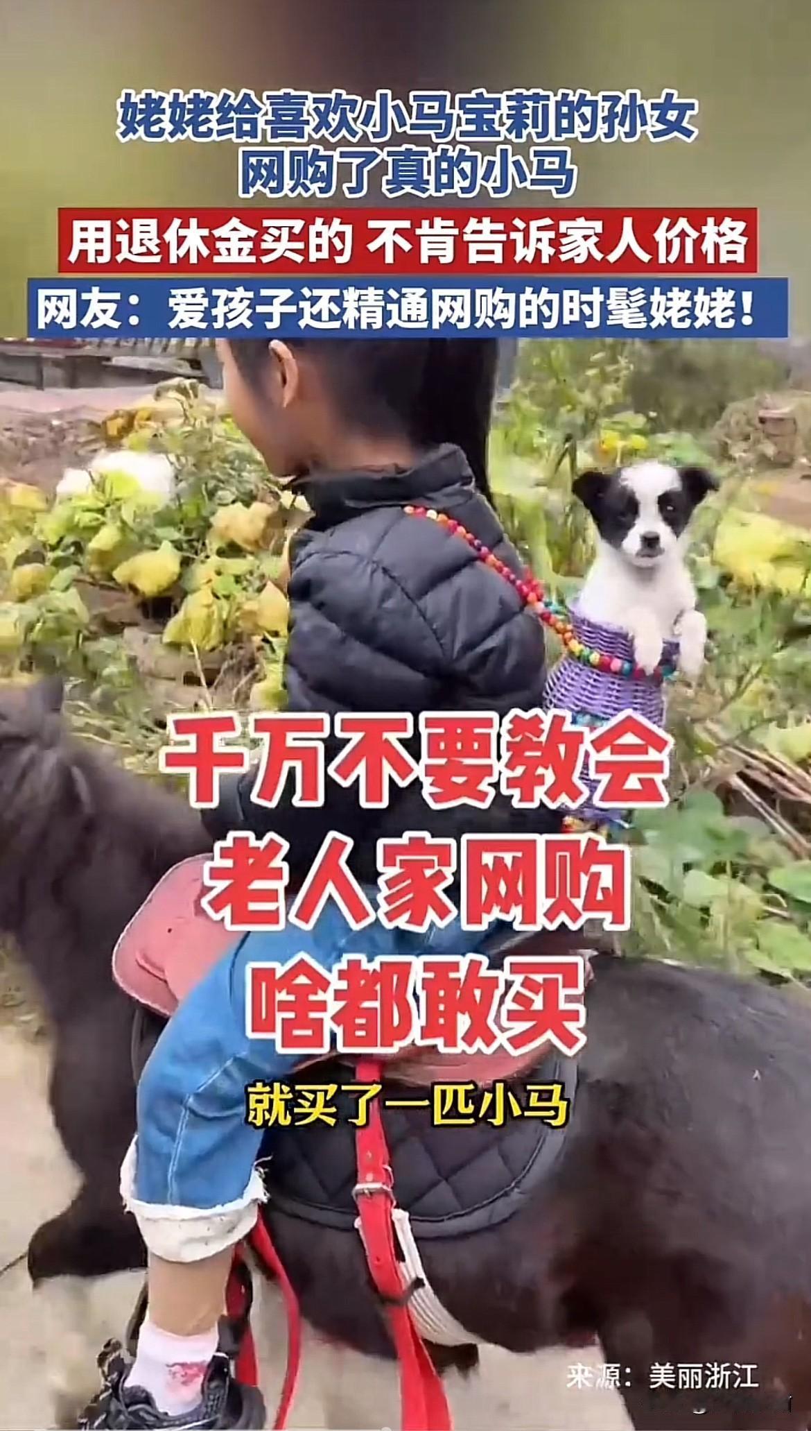 老年人会网购了,真是啥都敢买呀, 就因为外孙女喜欢小马宝莉, 姥姥竟然直接网购了一匹小矮马。 真的不得不说隔辈亲呀,就因为自己的外孙女喜欢小马,姥姥竟然瞒着所有人花了几万块钱,网购了一匹小矮马,快递送到家了,家里人才知道。 我就想问问,活马都可以网购了吗?还可快递到家? 看着小孙女牵着小矮马遛弯,她还坐在小马上,背上背着小狗,那种欢乐,那种自豪,真的无法用语言来表达。 不敢想象,小时候的我如果有一匹小马,我绝对可以在村子里遛上几天,显摆好久。姥姥为外孙女网购小矮马