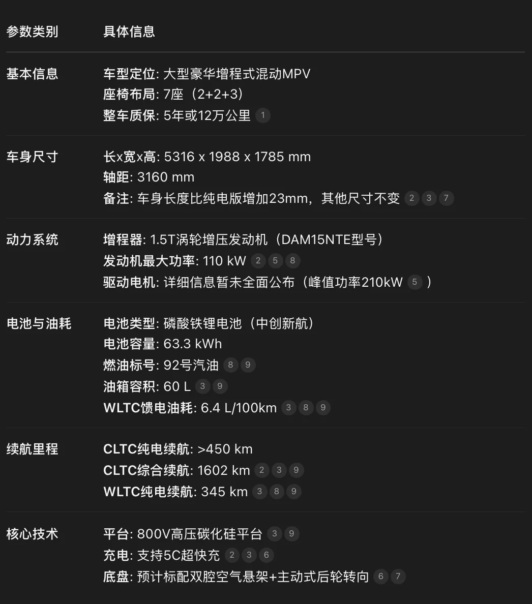 配置层面,增程器用的是东安1.5T发动机,然后电池是63.3度、油箱60L,所以纯电续航至少要400起步了,官宣的综合续航是1602公里,这个续航说超级增程确实没毛病