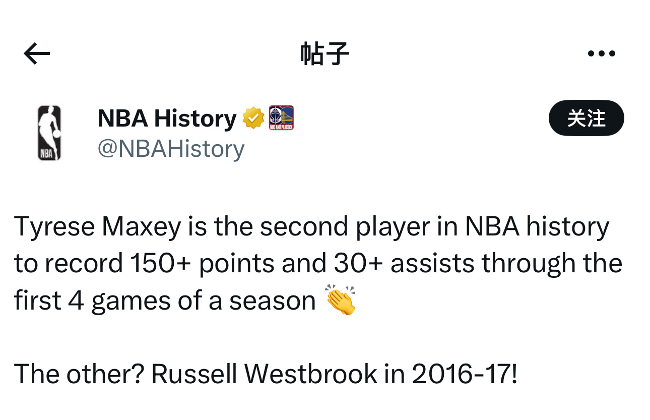 泰雷斯·马克西是NBA历史上第二位在赛季前四场比赛中得分超过150分且助攻超过30次的球员!👏