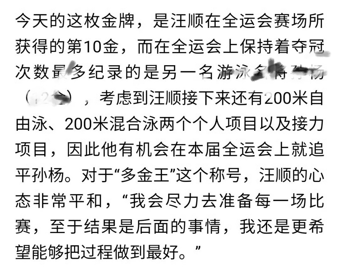 21年陕西全运会的时候记者在第一天就问汪顺对可能成为🥇数历史第一怎么看。顺也只是淡淡说【结果是后面的事情,我会把过程做到最好】