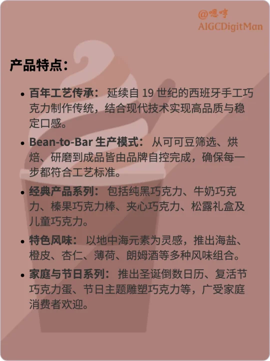 百年工艺传承: 延续自 19 世纪的西班牙手工巧克力制作传统,结合现代技术实现高品质与稳定口感。