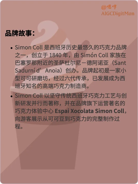 Simon Coll 是西班牙历史最悠久的巧克力品牌之一,创立于 1840 年,由 Simón Coll 家族在巴塞罗那附近的圣萨杜尔尼-德阿诺亚(Sant Sadurní d’Anoia)创办。