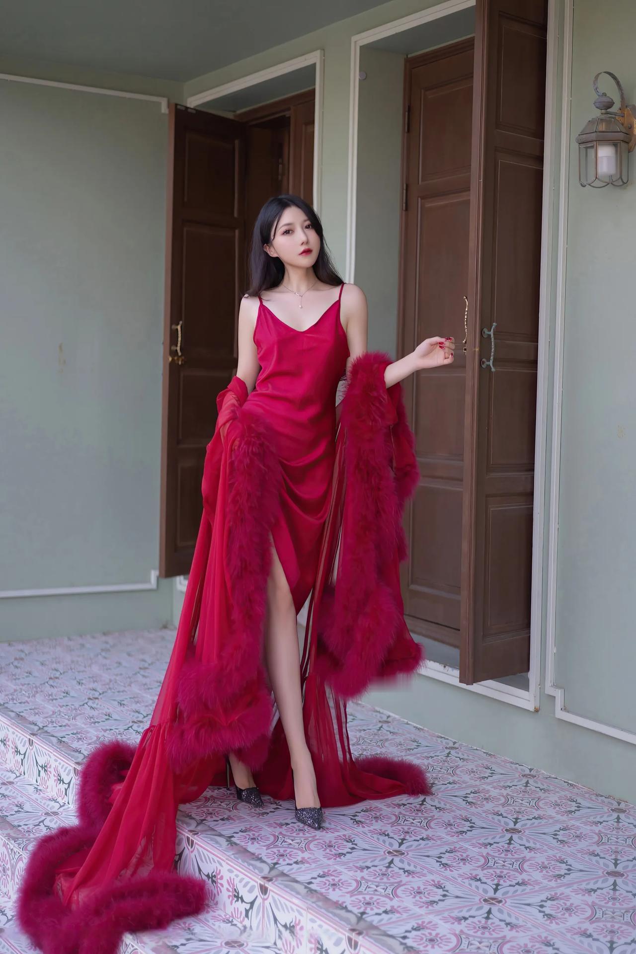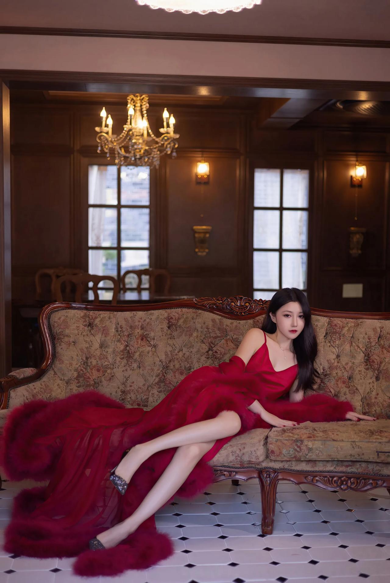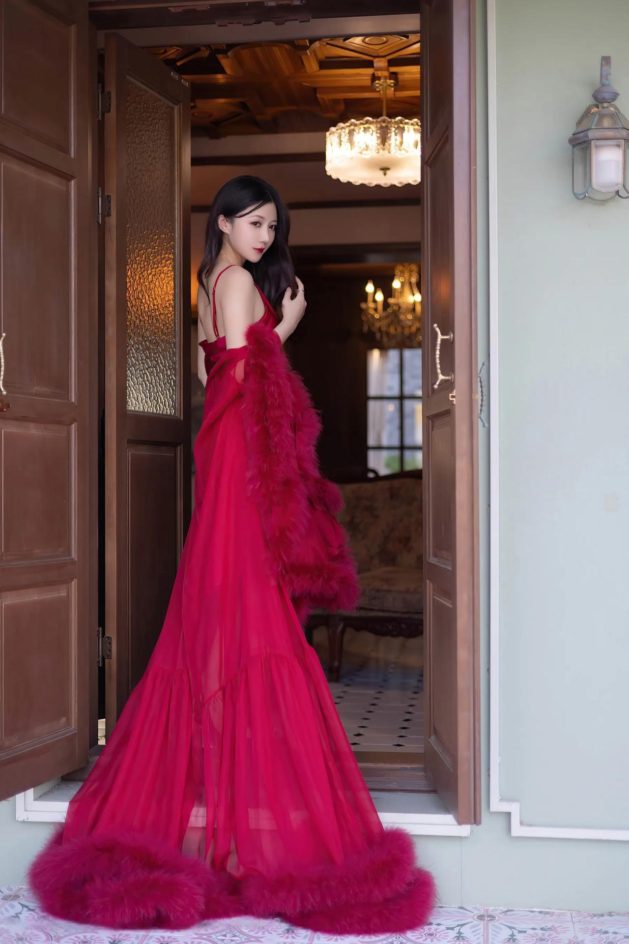 模特|鱼子酱Fish红裙复古宅邸间,一颦一笑皆成复古风情绝色画。
