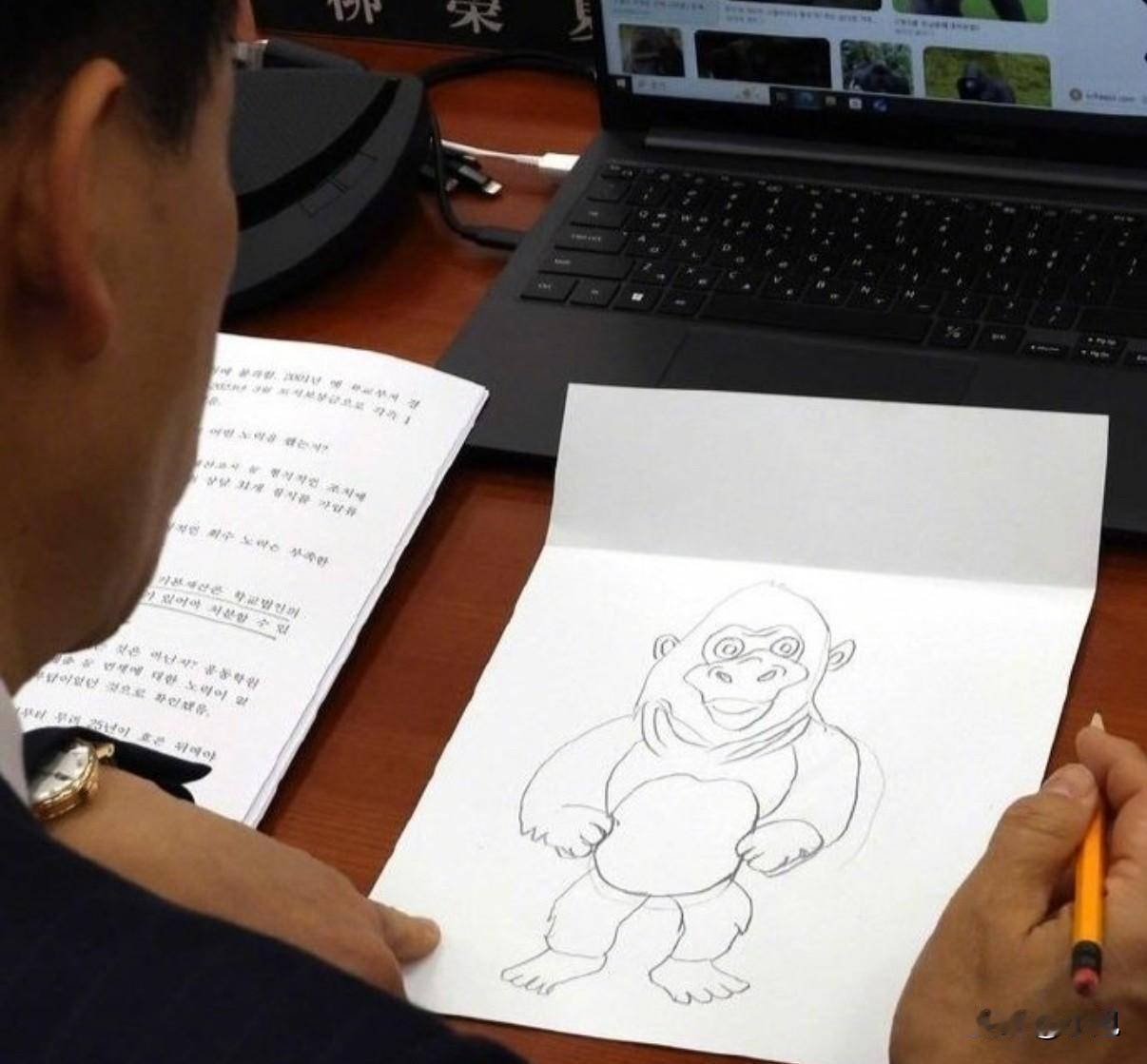 韩国议员开会画大猩猩被拍到,回应说平时只画十几秒,这次画大了多花几分钟。像极了上班摸鱼的我,只不过人家在国会摸鱼。 别说,画得还挺传神。这线条这构图,比小学生涂鸦强多了。建议开发副业,出个《国会动物园》画册。 我们摸鱼顶多发个微信刷个微博,人家直接搞艺术创作。果然大佬摸鱼都这么有创意。 不过普通员工摸鱼可能被扣钱,议员摸鱼还能开记者会解释。这差距,比大猩猩和人类的基因差距还大。 建议下回画个熊猫,至少还能促进外交。