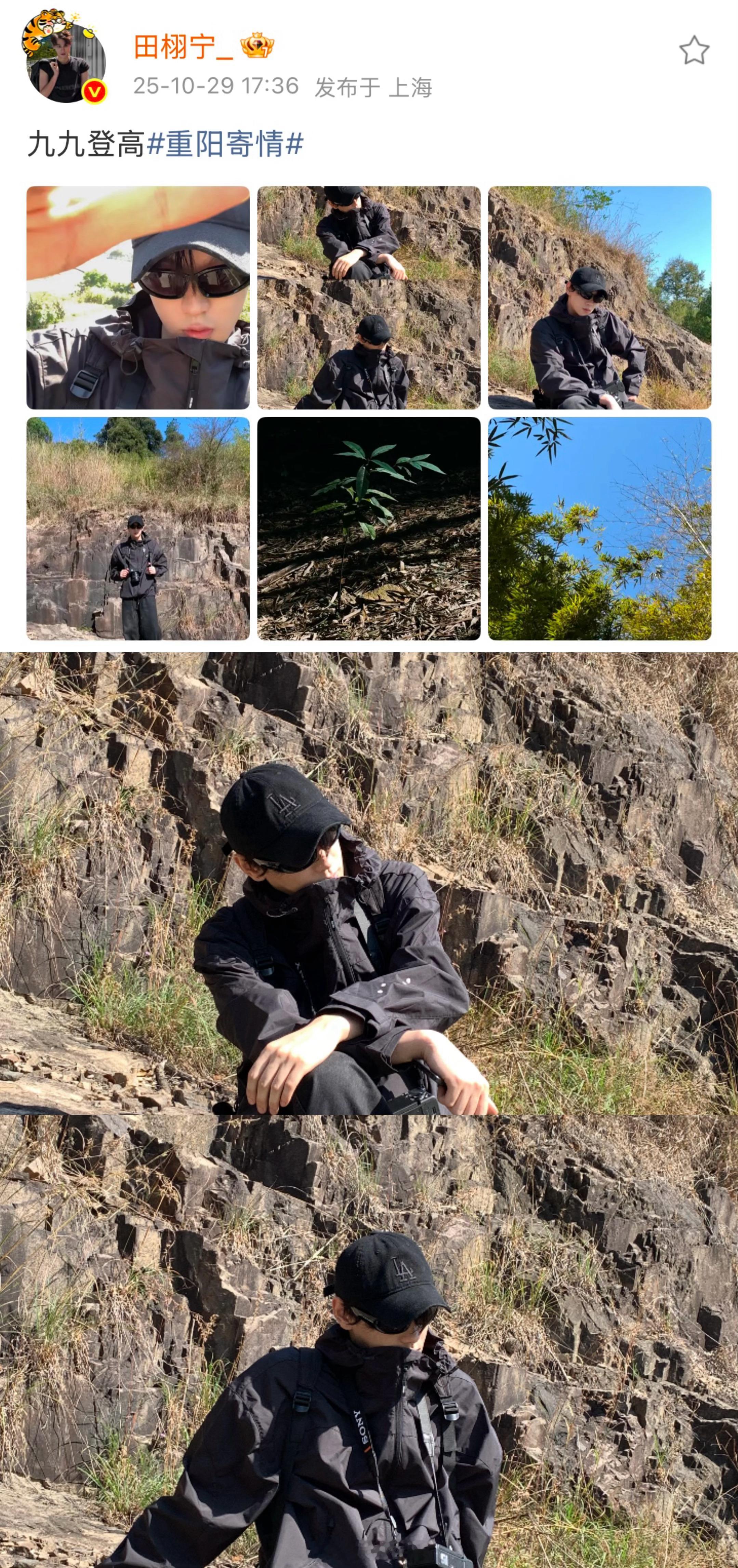 田栩宁空降超话营业,有温暖的重阳节祝福,也有登高望远的帅照!柠檬水好幸福~[期待]ps:田栩宁空降超话的含金量,就是爆。[点赞]田栩宁allblack登高