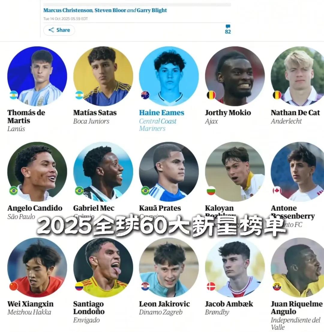 魏祥鑫入选了英国《卫报》“2025年度全球最具潜力60大新星”榜单,魏祥鑫是唯一入选的中国球员,亚洲一共有4名球员入选,另外3名分别是:日本J联赛磐田喜悦队的西冈健人、越南的阮国南,乌兹别克斯坦的舍尔祖德,卫报60大新星都是18岁以下的新人,魏祥鑫能上榜也证明了潜力无限,以前入选过成名的新星很多,比如现效力于皇马的姆巴佩、利物浦的伊萨克与维尔茨,以及迈阿密国际的梅西等,都曾登上过这份榜单。 魏祥鑫来自中超梅州客家,他在本赛季中超联赛出场15次,还为梅州客家打进了1个球,多次入选∪系列国家队,魏祥鑫目前德转身价20万欧元,模板:曼朱基奇,魏祥鑫今年曾去法甲欧塞尔俱乐部试训了3周,虽然后面没有成功,但是更坚定了魏祥鑫留洋的梦想,17岁新星魏祥鑫曾霸气宣言,自己目标五大联赛,第一个目标是先超越武磊,想做中国第一人,大目标C罗,想在五大联赛一直踢下去,为魏祥鑫的这种大胆梦想点赞👍👍👍 《卫报》对魏祥鑫的评语中提到,他年初加盟梅州客家后崭露头角,成为第一位在中超踢球的2008年出生的球员,他有着光明的未来。