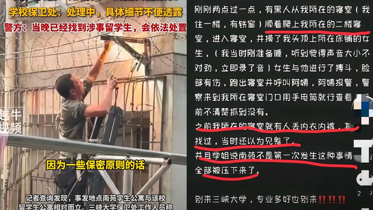 连夜装了铁丝网! 湖北宜昌,女生在学校宿舍睡觉,睡着睡着感觉有人摸自己,她睁眼一看,竟是个外国留学生,不知道怎么偷偷溜了进来。 但这女生是真刚,没吓得不敢动,当场就大声呵斥,见对方要跑还直接追上去扭打,动静引来了宿管和同学,最后把人抓了现行。学校还算给力,火速开除了这名留学生,警方也把人带走调查,没姑息纵容。之后学校连夜装铁丝网,总算补了防护漏洞。 说真的,能来中国留学本是多好的机会,好好学知识回去建设自己国家多好?可偏有人把留学当度假,不仅不务正业,还干出这种违法又丢人的事,既浪费了机会,也给自己国家的形象抹黑。别拿“留学生”当特殊身份,在中国就得守中国的规矩,不管是谁,犯了错就该受罚,这才是对所有人的公平。 大家觉得,除了装铁丝网,学校还该在哪些方面加强宿舍安全?来评论区聊聊你的想法!晒图笔记大赛湖北宜昌 三峡 留学生