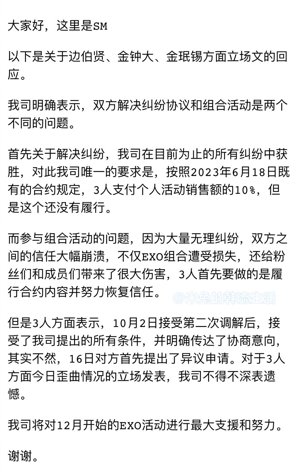 SM回应CBX立场:CBX未按照合约支付个人活动销售额的10%,并以大量无理纠纷破坏双方信任,另外CBX并没有像自己说的那样接受SM所有要求
