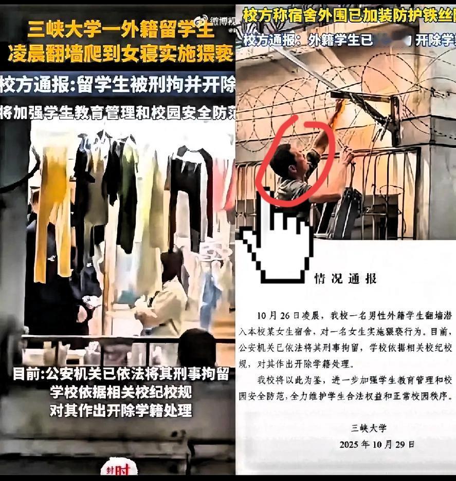 现在最该坐不住的,何止是三峡大学的校长?这事儿根本不是“一个留学生毁了学校”,而是藏不住的管理漏洞早晚会炸锅。 凌晨两点翻墙进女寝动手,幸亏女生拼命反抗才没酿大祸,涉事学生被刑拘开除是该有的结果 。可网友怒的不是处理慢,是学校早有预警却装没看见——这栋楼早丢过内衣、有过偷窥,防护刺只装一楼,二楼等于没设防。 更让人窝火的是出事先捂嘴,解散宿舍群不让说,逼得学生只能上网爆料。加装防护网、查监控这些补救,早干嘛去了?国际化办学不是“特殊对待”的借口,更不能拿学生安全换所谓的“面子”。 真正该较真的,是别让“亡羊补牢”成了校园安全的常态。你们觉得,该怎么盯着学校把漏洞真堵上?来评论区聊聊。