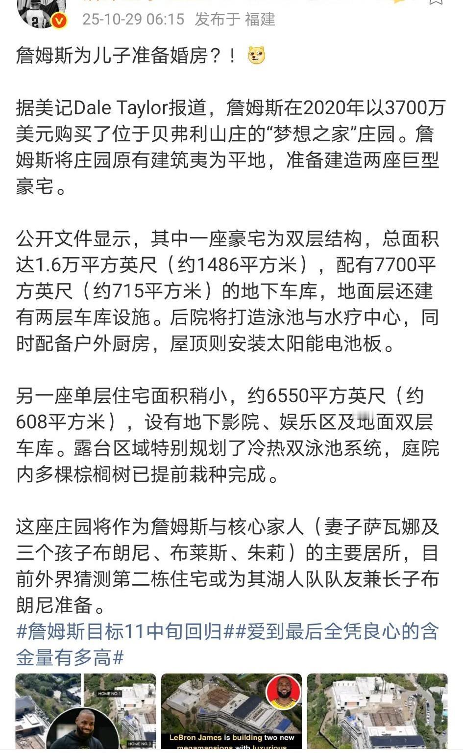 詹姆斯发布新书:《好莱坞式的结局——勒布朗-詹姆斯带来的梦想与戏码》。里面有一段跟浓眉的对话,可以说把他的丑恶嘴脸展露无遗…… 詹姆斯为儿子准备婚房?詹姆斯将现住庄园原有建筑夷为平地,准备建造两座巨型豪宅。