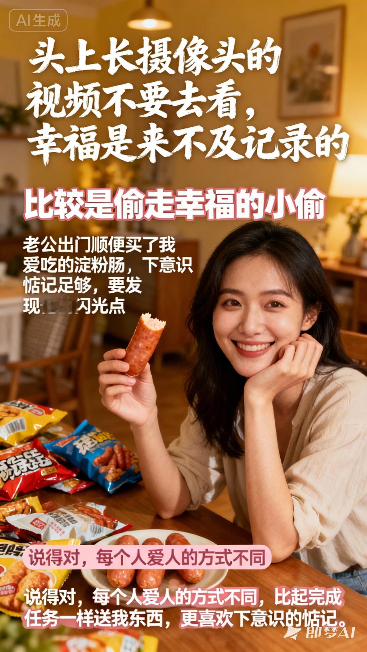 头上长摄像头的情侣博主 千万不要再去看了。 真的会毒害观看的每一个人 记住“幸福是来不及记录的” 你对象爱你的瞬间, 幸福是来不及记录的 瞬间是什么,“一闪而逝” 在你想记录的时候, 这件事就已经完成了, 不可能在为了记录而去重演一遍。 就算你重演这一件事, 本质上就已经发生了改变。 刚看视频的第一眼, 你就会潜移默化的觉得 为什么别人的对象做的那么好, 为什么你自己的对象做不到呢? 两个人在一起, 要发现对方的“闪光灯” 你们俩发生矛盾, 要坐下来好好谈一谈。 你对象可能是“指令行”动物 你要讲出来, 他才能更好的完成。 记住: 千万不要去比较, 有什么问题, 就“打直球”的和他讲明白 比较是偷走幸福的“小偷”, 一个人生闷气就是“帮凶”。 主播摄像头