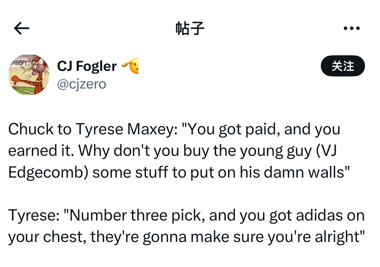 巴克利对马克西说:“你签了大合同,而且是你应得的。为什么不给那小子(VJ·埃奇库姆)整点东西装饰下他光秃秃的墙壁?”