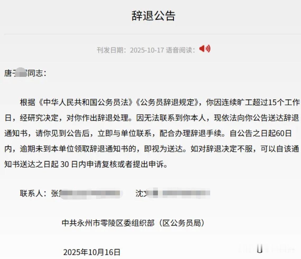 公务员也能说开就开? 当然了,只要违反规定照开不误 很多人觉得公务员是 “金不换” 的铁饭碗,只要考上就一辈子安稳。 但最近贵阳一名公务员曹某因为连续旷工超过 15 个工作日,被单位公开辞退 有人说 “干得漂亮!就该让那些占着位置不干活的人滚蛋” 也有人说 “会不会有什么隐情?比如身体不好或者单位刁难? 还有人说 “我们私企迟到几次就扣钱,公务员旷工 15 天才辞退,待遇差远了! 公告中说“无法联系到本人” 我就纳闷了为什么无法联系到本人?如果仅单位联系不到,而家人朋友可以联系上。真是一头雾水…… 其实大家纠结的不是“公务员该不该被辞退”,而是对 “职场公平” 的期待 ——不管什么身份,干活就得有干活的样子,不能有人占着资源不干事。普通人加班熬夜怕被裁,公务员要是摆烂躺平,也得付出代价,这才叫公平。 总之,靠谱的人永远有饭吃,摆烂的人在哪都悬。你对这事咋看?