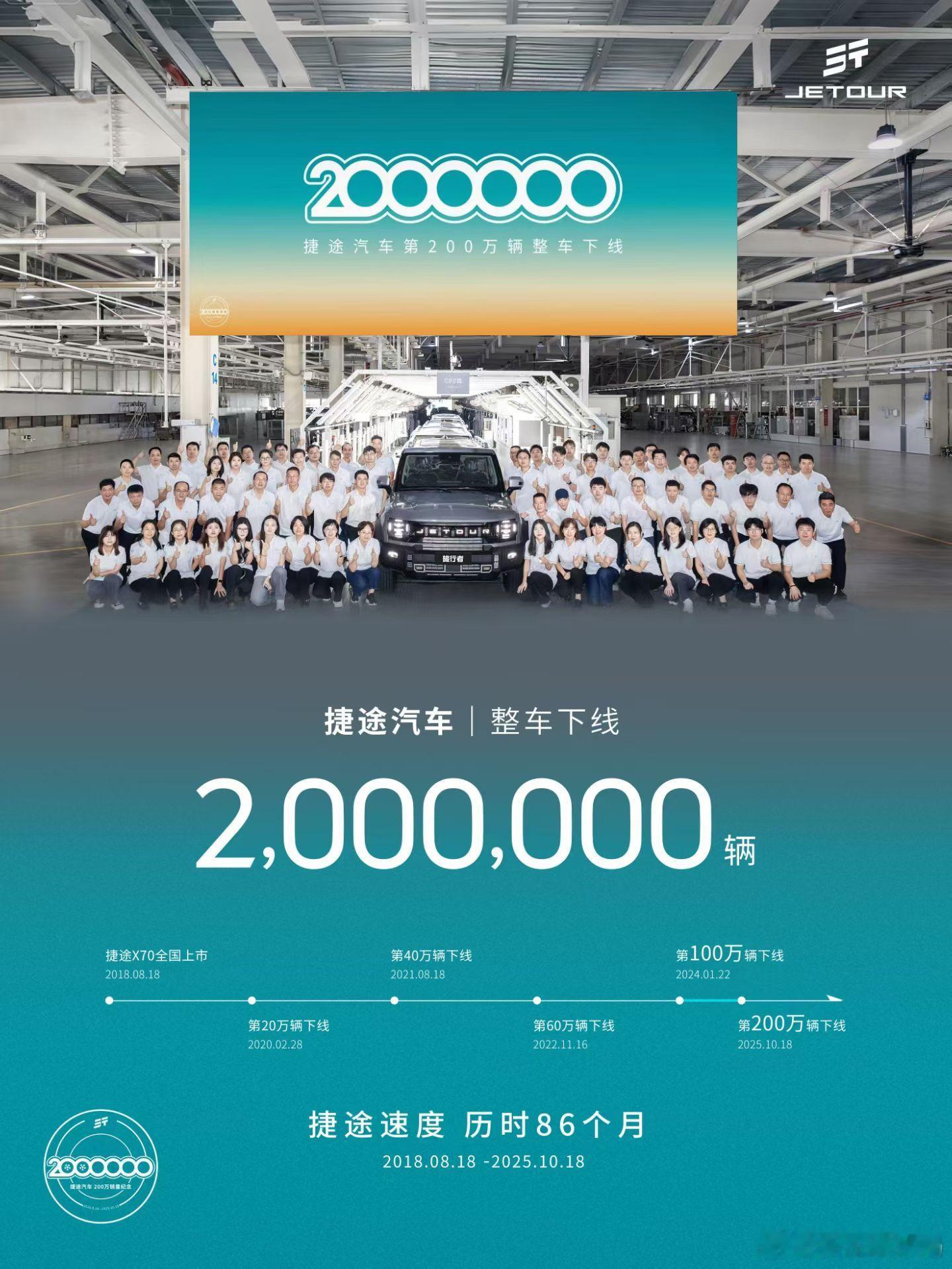 捷途汽车第200万台整车下线新车情报局 日前,我们从获悉,捷途汽车已迎来第200万台整车下线。从2018年8月18日品牌首款车型——捷途X70上市至今,仅用了86个月时间。值得一提的是,从2024年1月22日的第100万台下线,仅用了21个月的时间就实现了百万销量,提速明显。