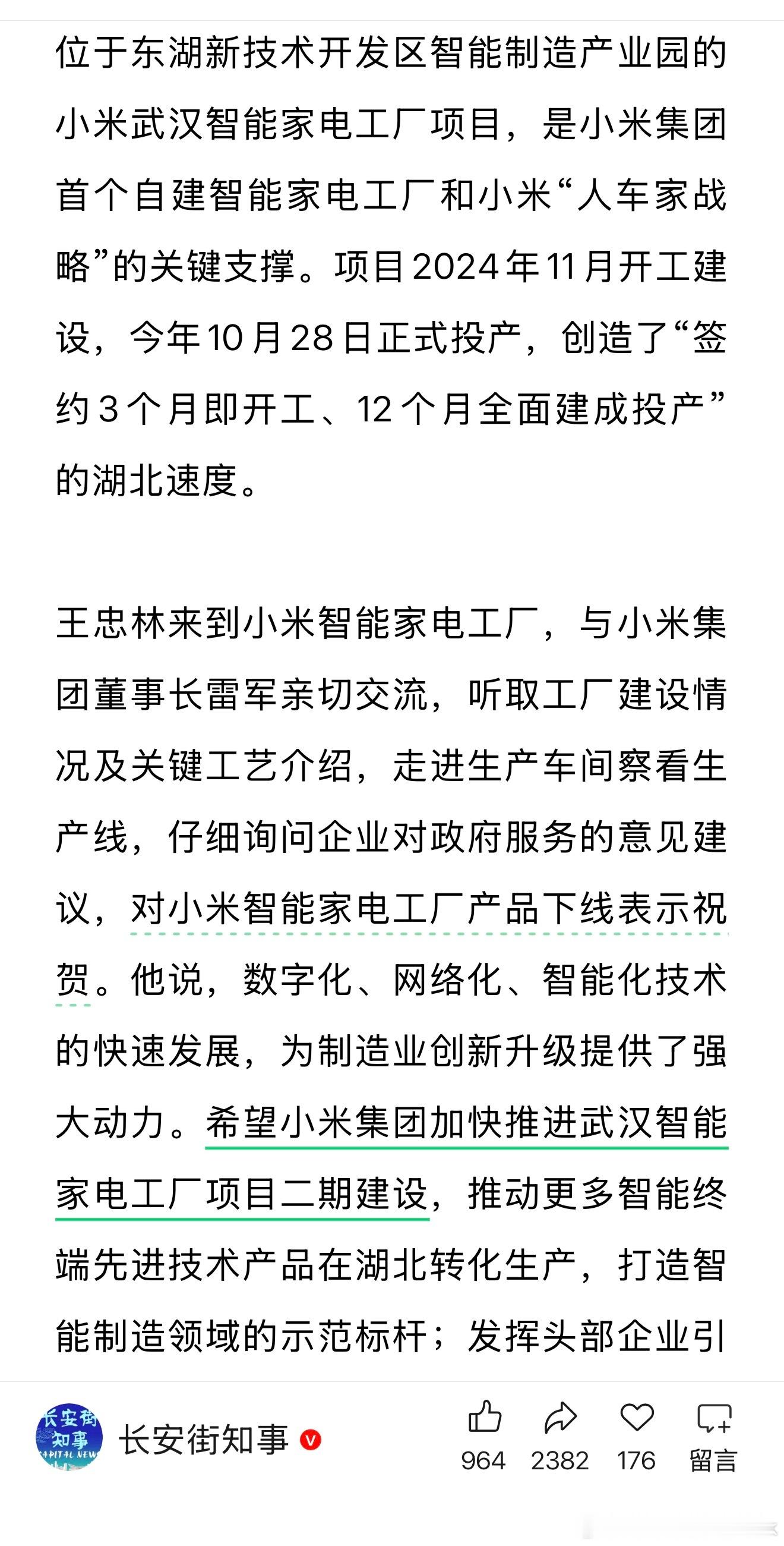 小米智能家电工厂落地,在我看来小米的战略是和国家的制造业创新升级方向同频的,湖北省委书记都亲临现场调研表达祝贺[举手]一个行业头部智能工厂落地不仅能带动当地大量的就业,还能吸引更多产供链企业集聚,形成强大的产业集群效应,拉动一个地区的发展。看新闻里说的,小米智能家电工厂二期项目估计也快了。